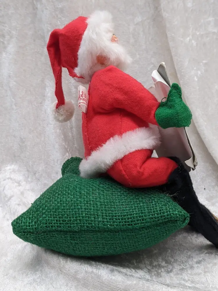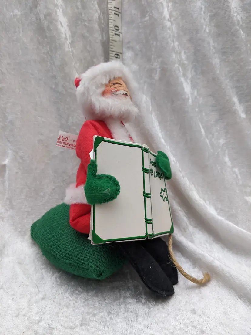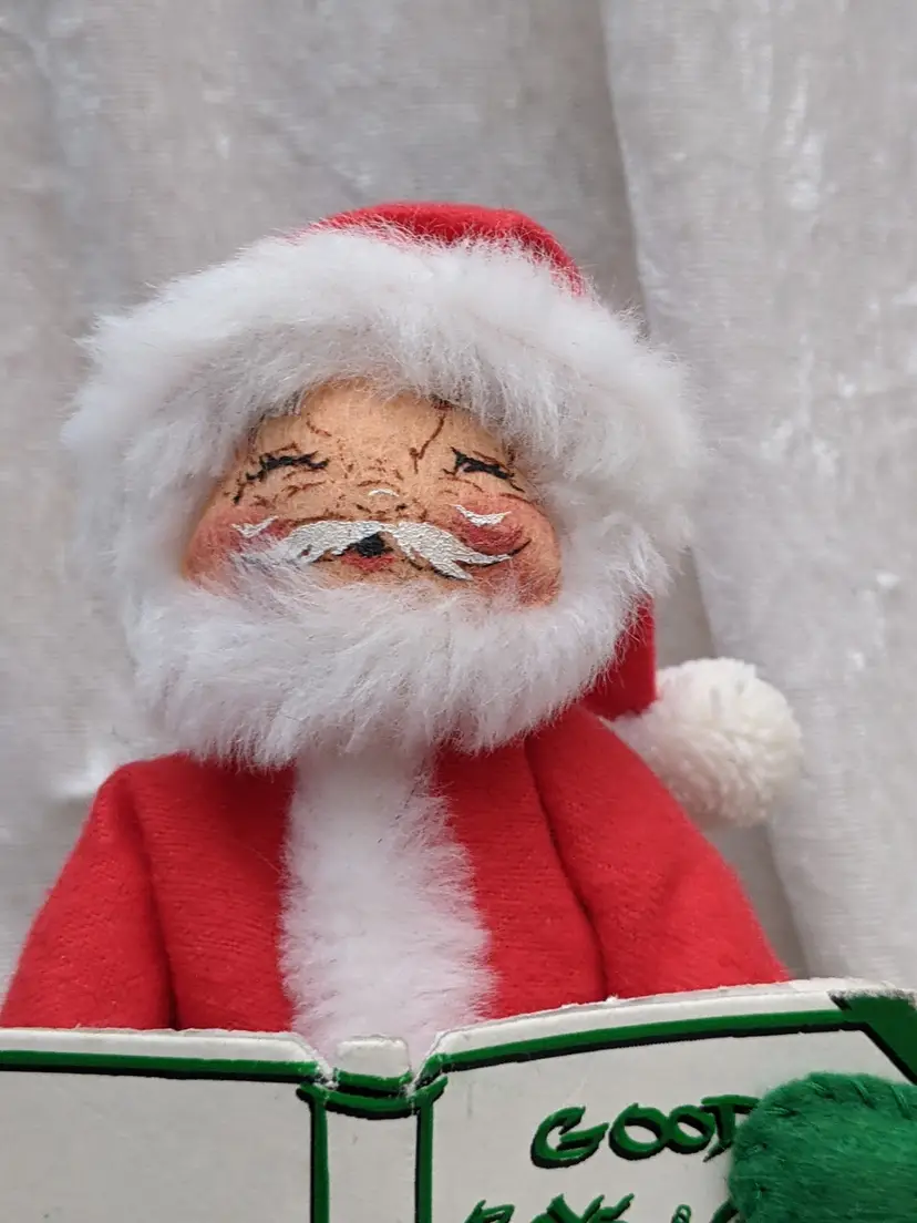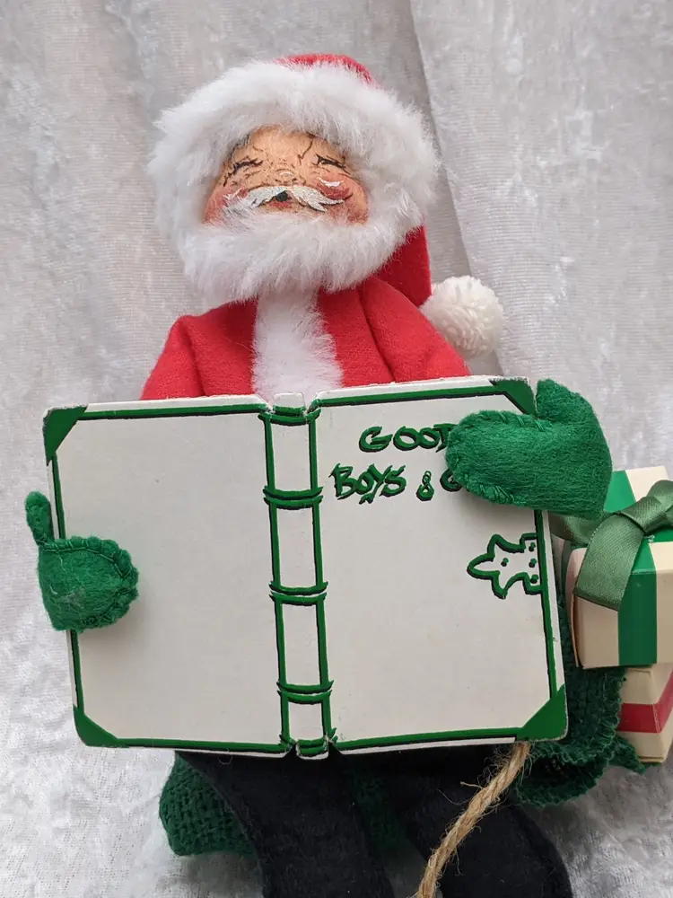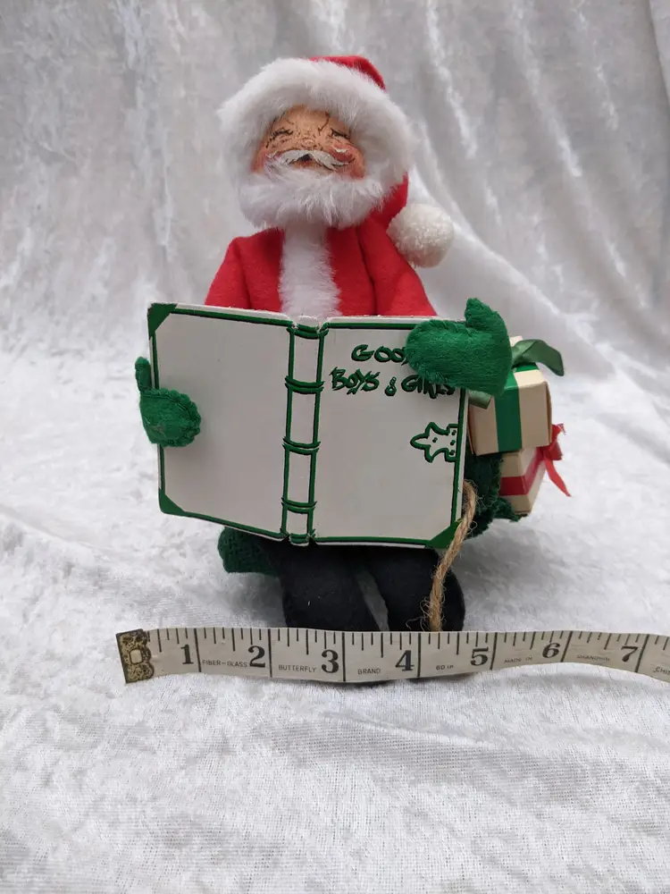 VTG Annalee 8" Santa Mobilitee Doll sitting on his bag Bag with Presents reading a book of Good Boys Girls Christmas decor . He is 7in wide and 8 in tall. Very good condition Clean with no damage. no weird smells. Please check the photos for details. Comes from a smoke free home. We do have pets.
