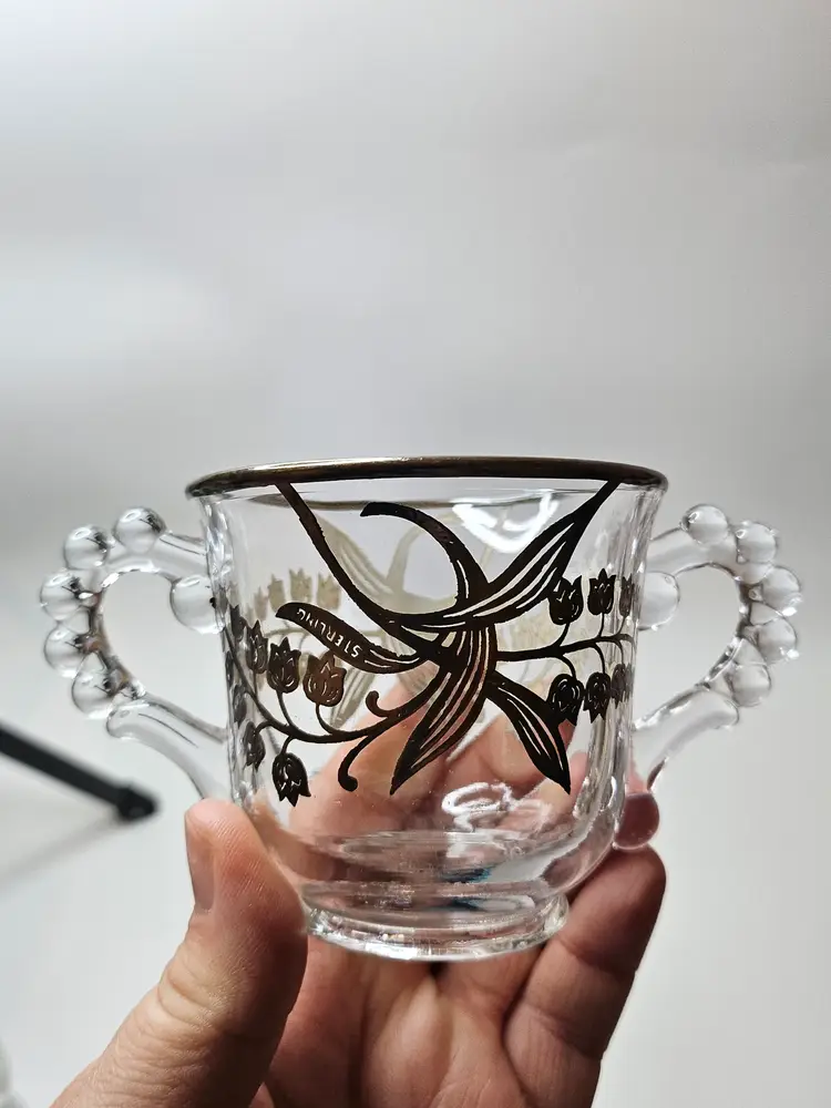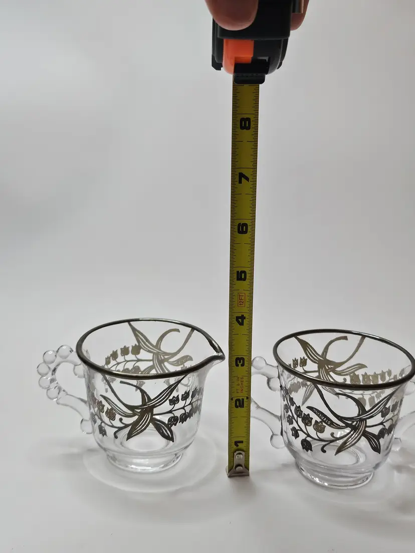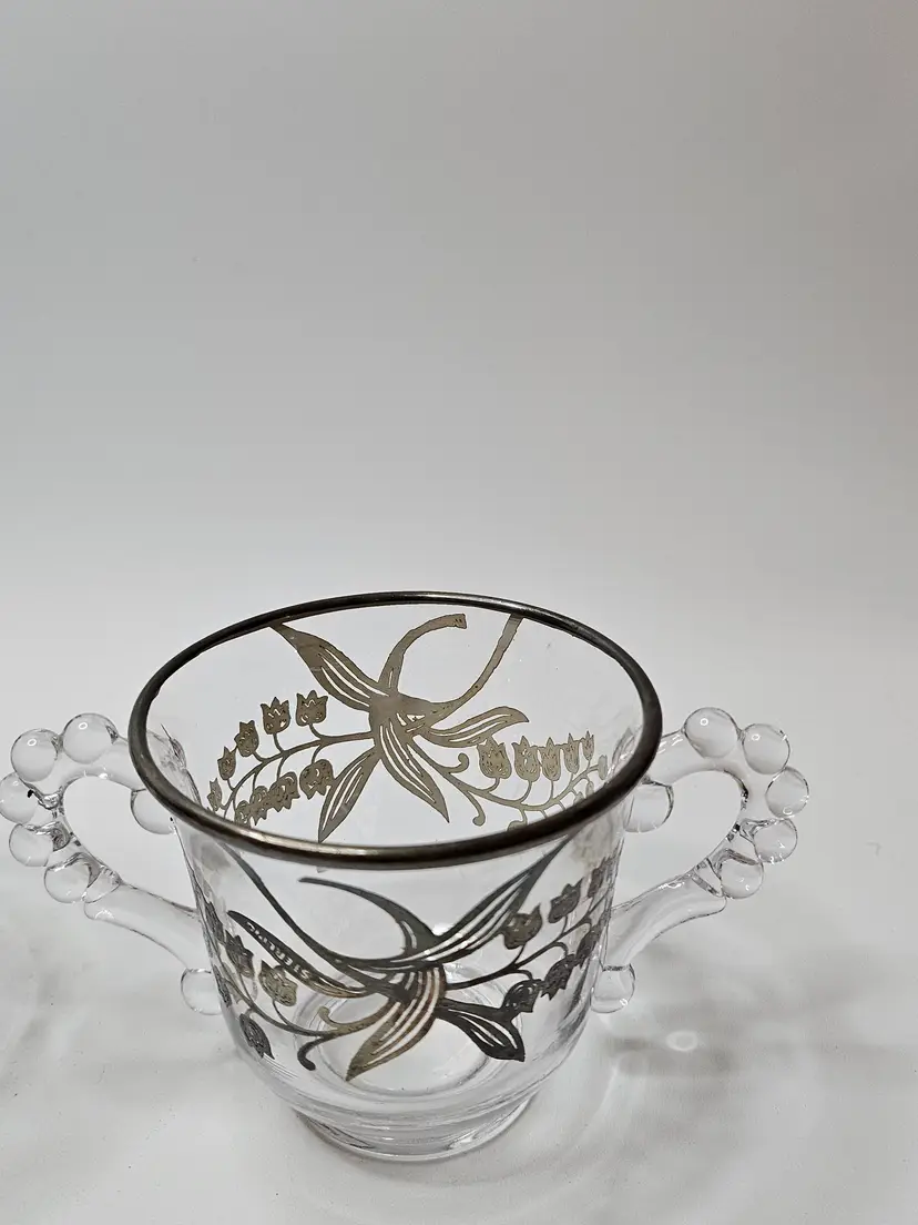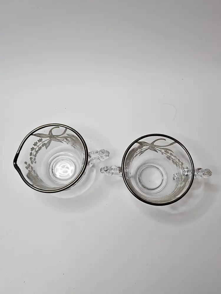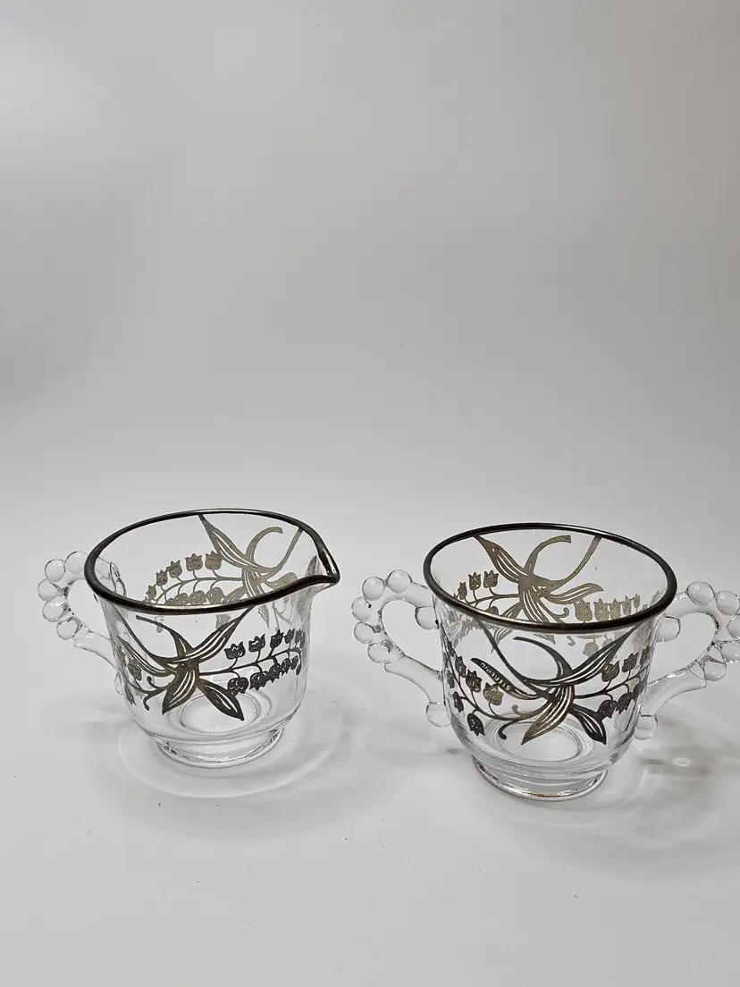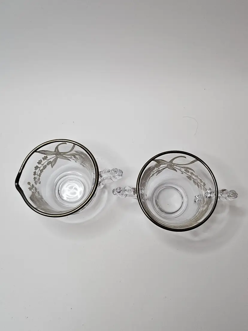 The vintage Candlewick Imperial Glass Open Sugar and Creamer Set features a sterling silver overlay on the glass, creating an elegant and decorative design. This creamer set is part of the Candlewick product line by Imperial Glass, known for its hand-blown glass production technique and floral pattern. The set is clear glass with a sterling silver overlay and requires hand washing for care, highlighting its original and vintage nature in the realm of elegant glassware.