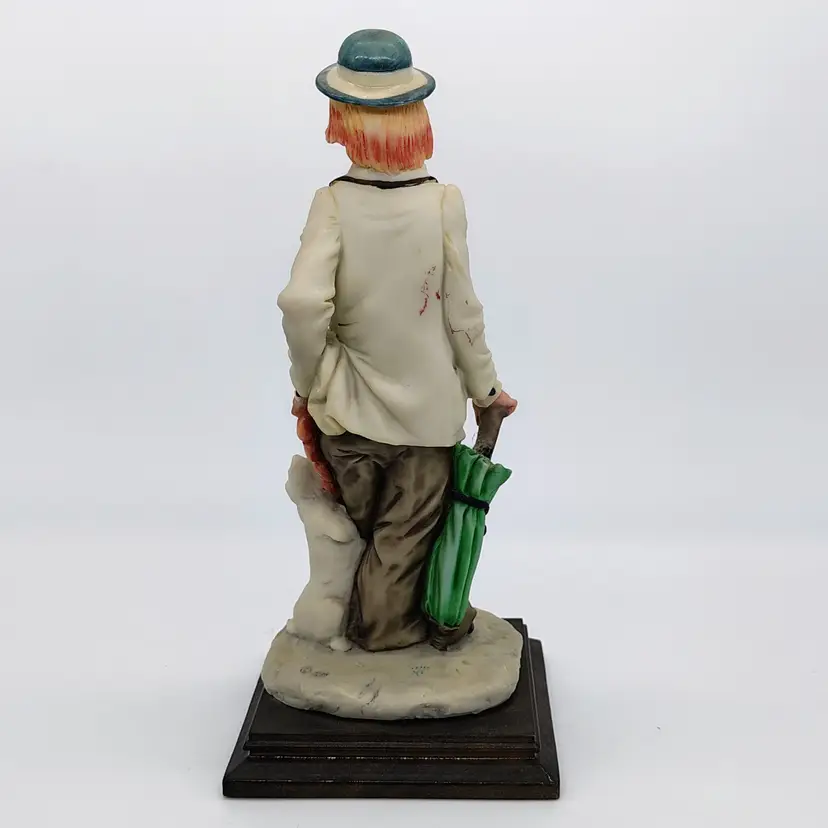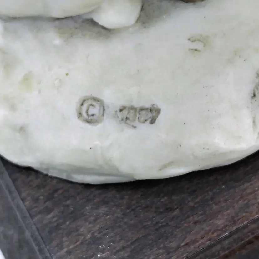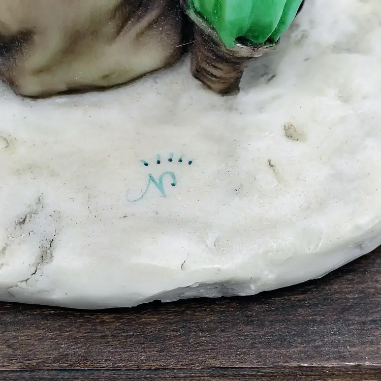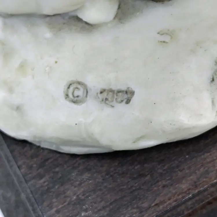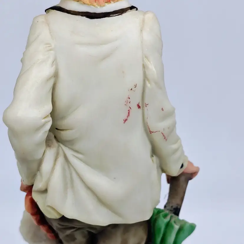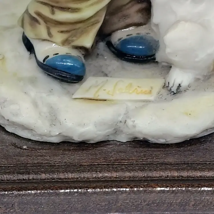 This figurine stands approx 11 in tall. It is signed by the artist and dated and marked. There is a tiny area of red colored material on the right back as noted in picture