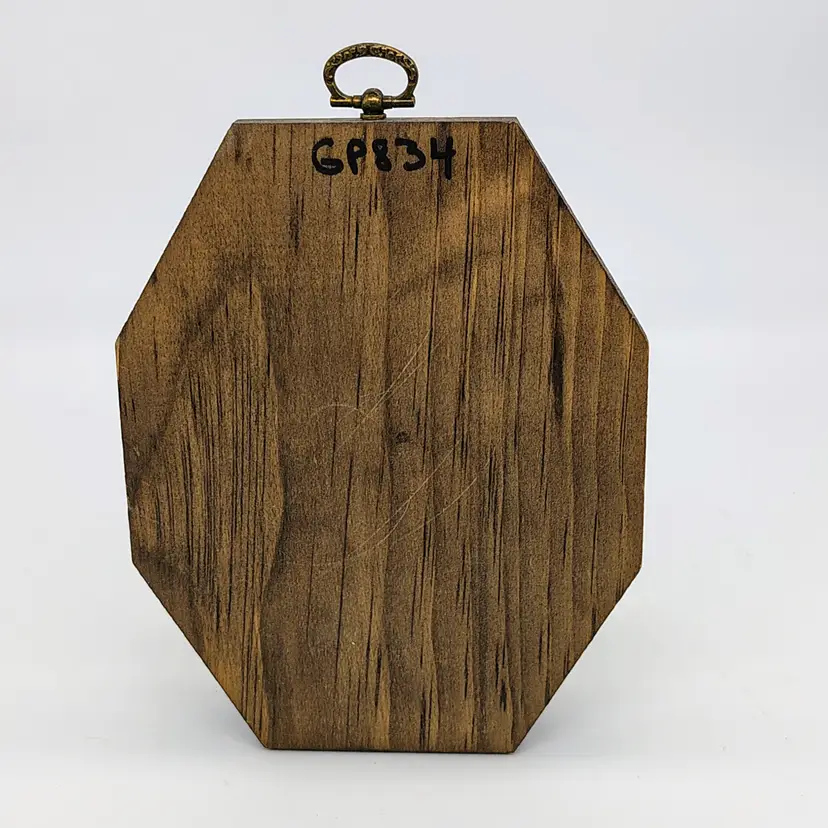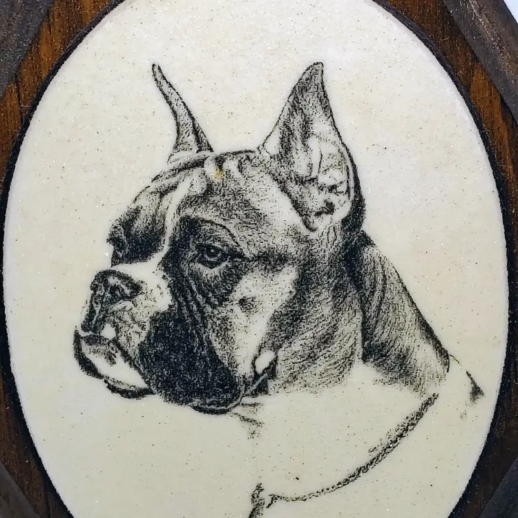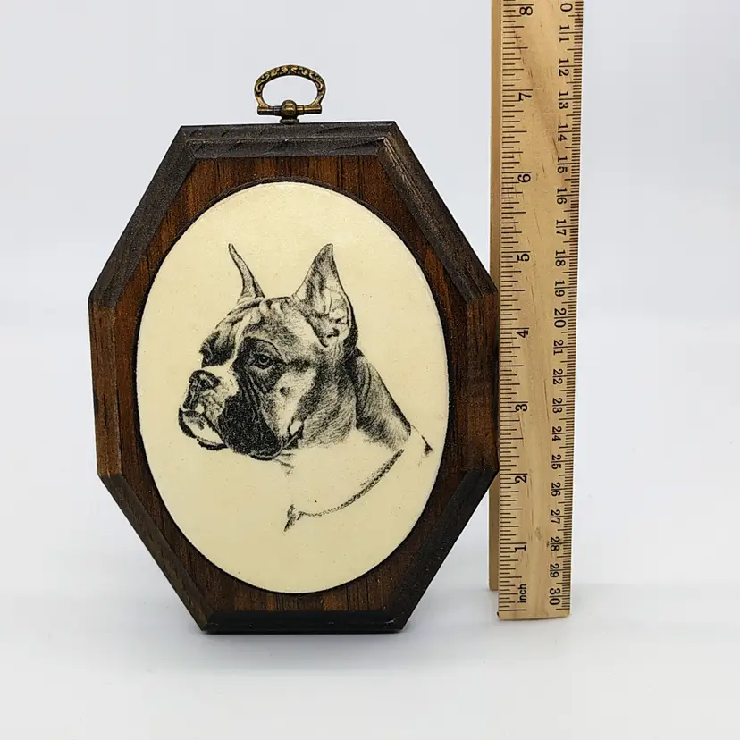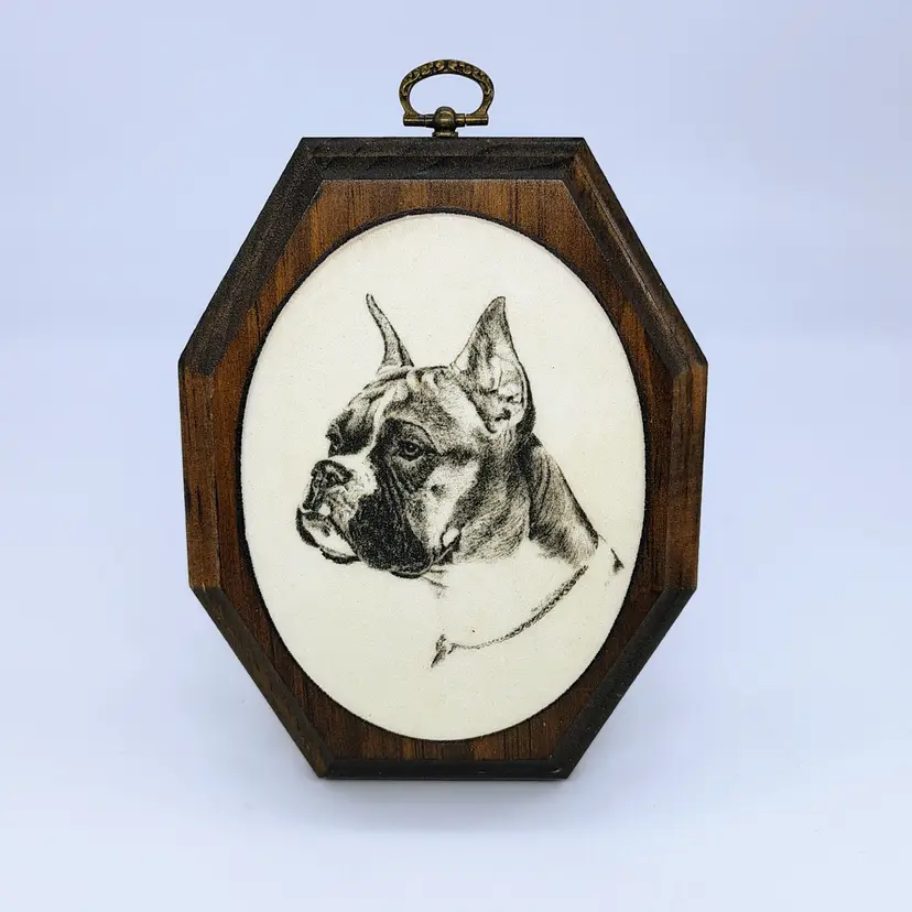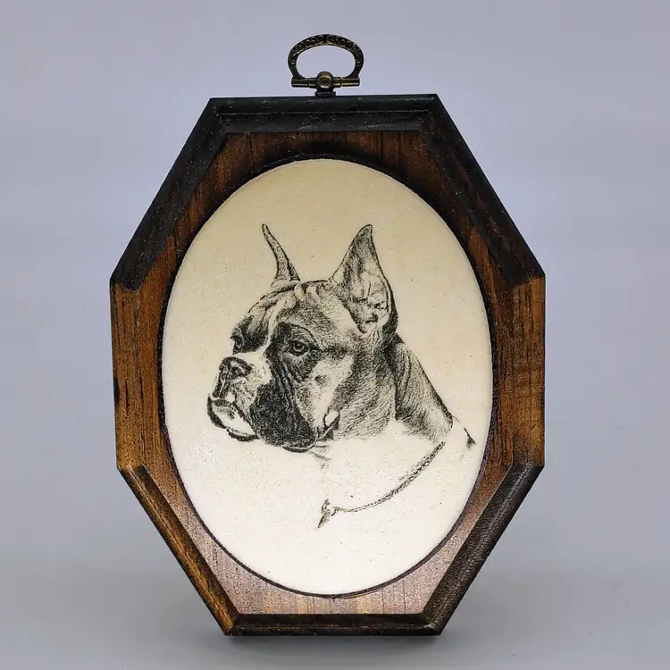 This is a vintage portrait of a Boxer mounted on an octagonal wood mount