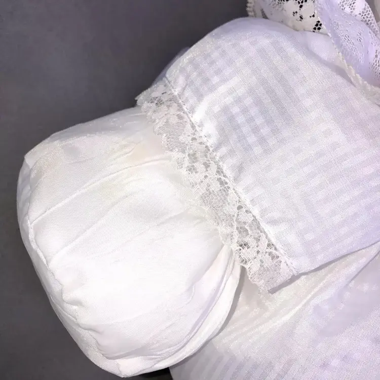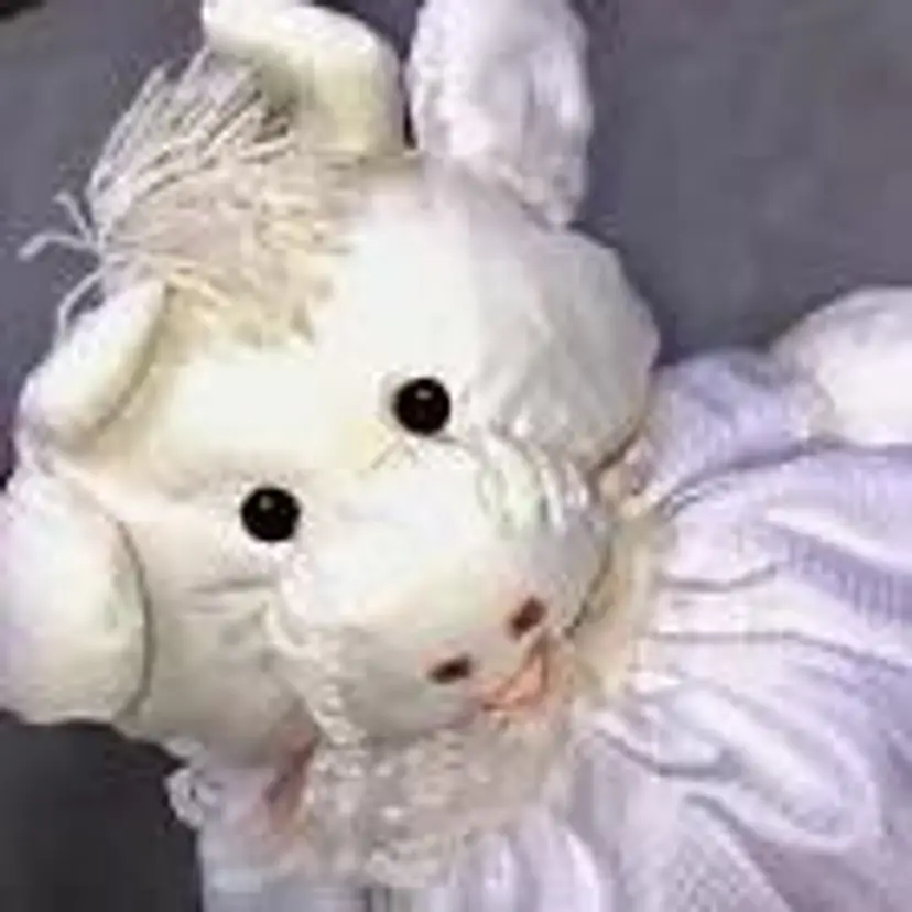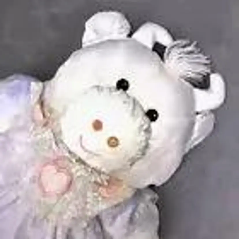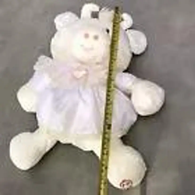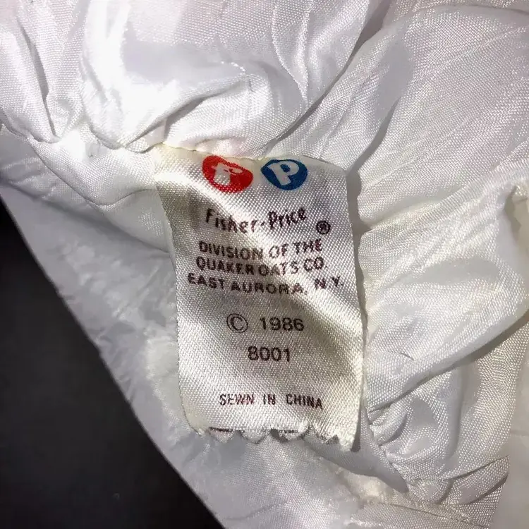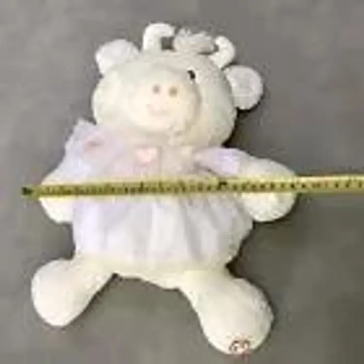 VTG Fisher Price toy Stuffed Animal Plush made with parachute-type soft material. 1986 PUFFALUMP # 8001 WHITE COW (see photos for tag and washing instructions). Plush has the original Fisher Price logo embroidered patch which has been stitched onto the bottom of foot. Plush is dressed in the original delicate pastel purple gingham dress with embroidered pink hearts and trimmed in lace. For size, please see photos with measuring aid. READ see photos for a number of discolorations on plush (face & legs); the tag notes that this plush is washable, but seller will not wash (selling as is). (inventory location: Box A6) Condition: Used Size: Medium (14-24 in) Color: White Brand: Fisher-Price Type: Stuffed Animal Year: 1986 Animal: Cow Features: Washable Country/Region of Manufacture: China Character Family:Puffalumps