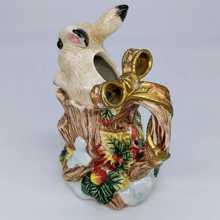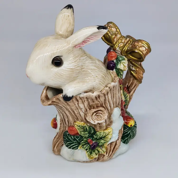 Snowy Woods Holiday Rabbit in a Tree Stump, No chips or cracks