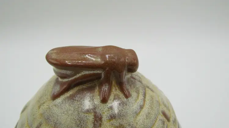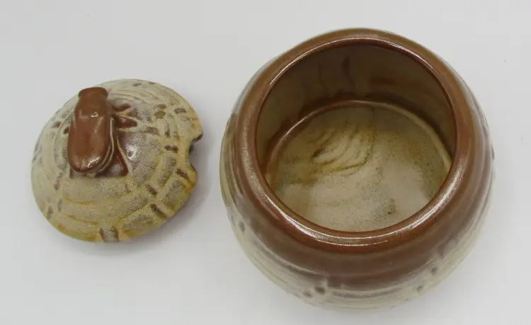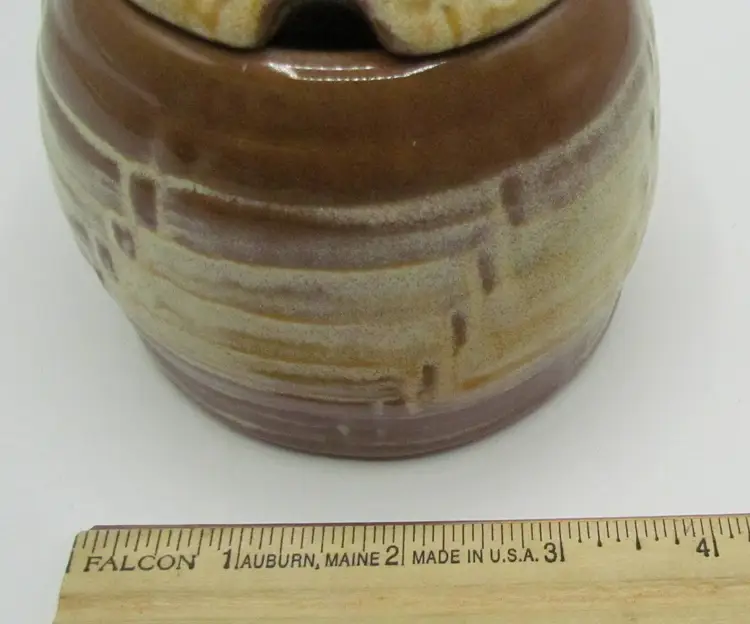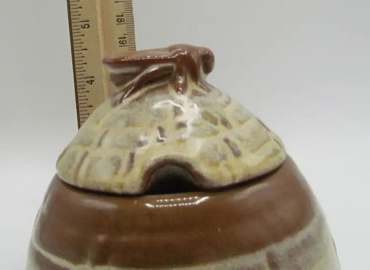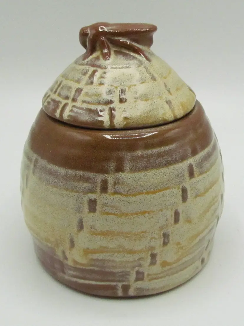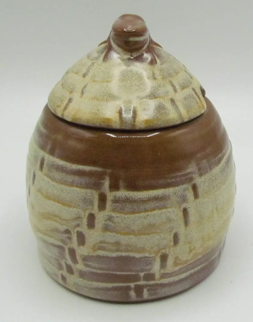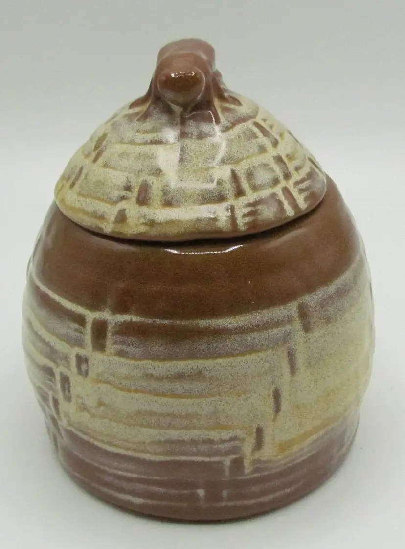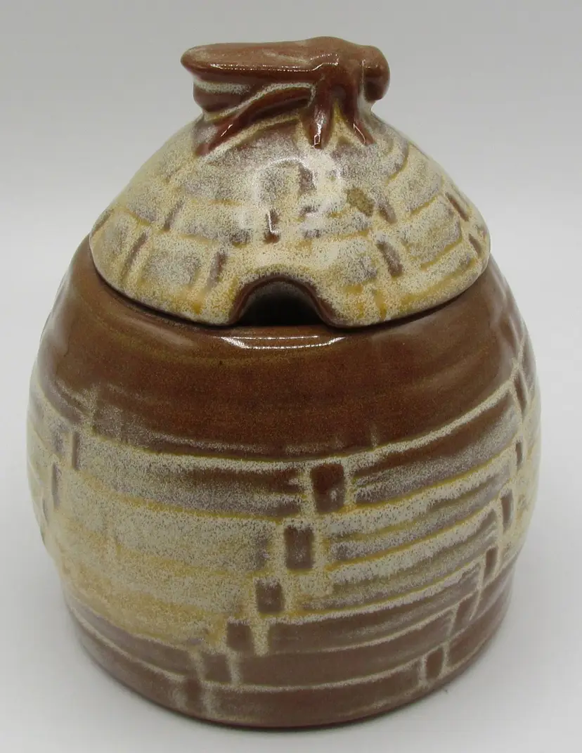 This vintage Frankoma/Gracetone honey pot is a beautiful addition to any collection. With a round shape and glossy finish, it features an all-over Plainsman Brown color and is made of clay. The pot comes with a Bee finial on the lid. There is not a Dipper. Great condition no cracks or chips