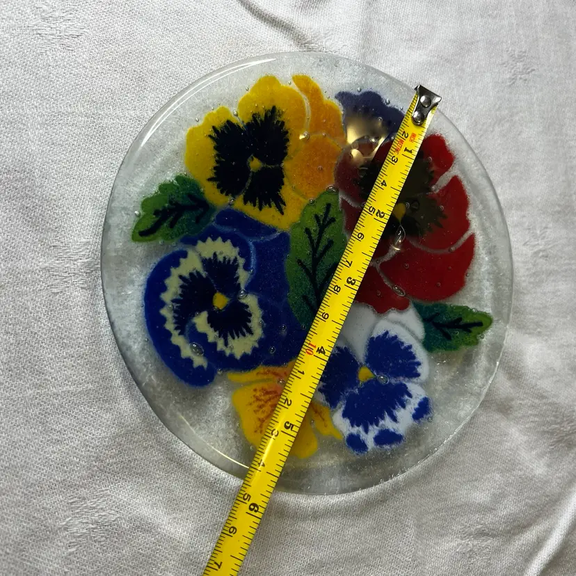 Small, brightly colored pansy flowered design. Vintage fused glass. Measurements in photos.