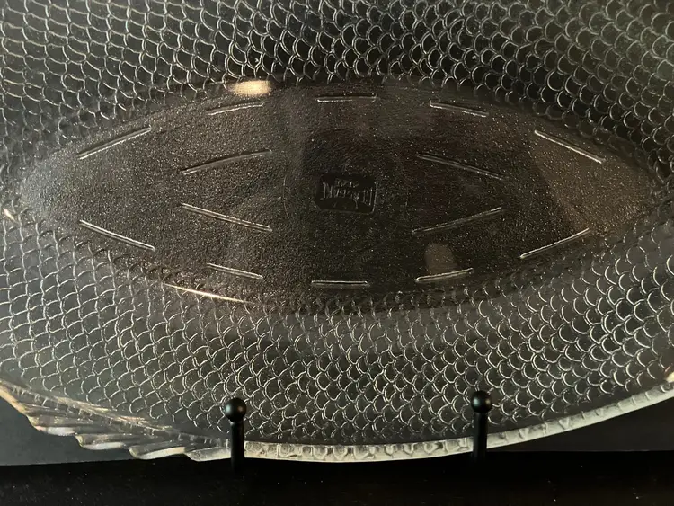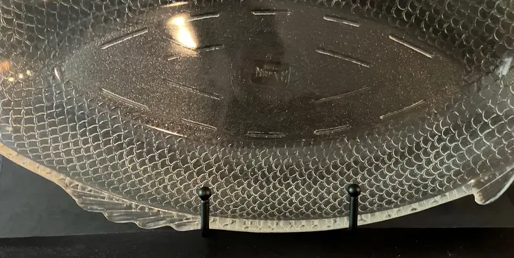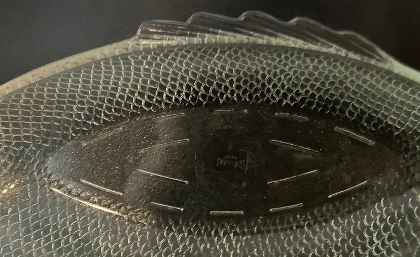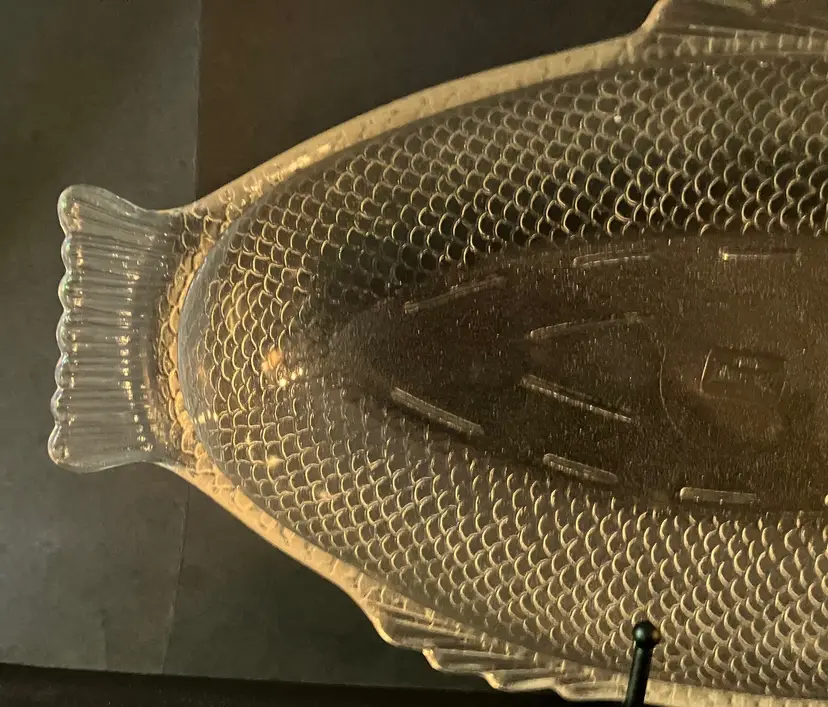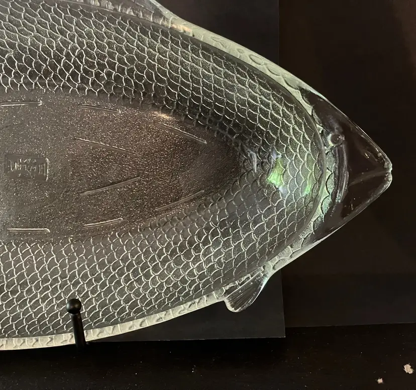 The exterior of the platter features a raised fish scale pattern, while the interior is smooth glass. No condition issues. Measurements: 18" by 8 1/2" by 2 1/4". Weighs 3 1/4" lbs before packaging.