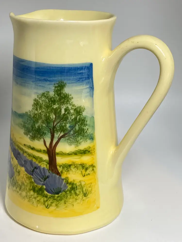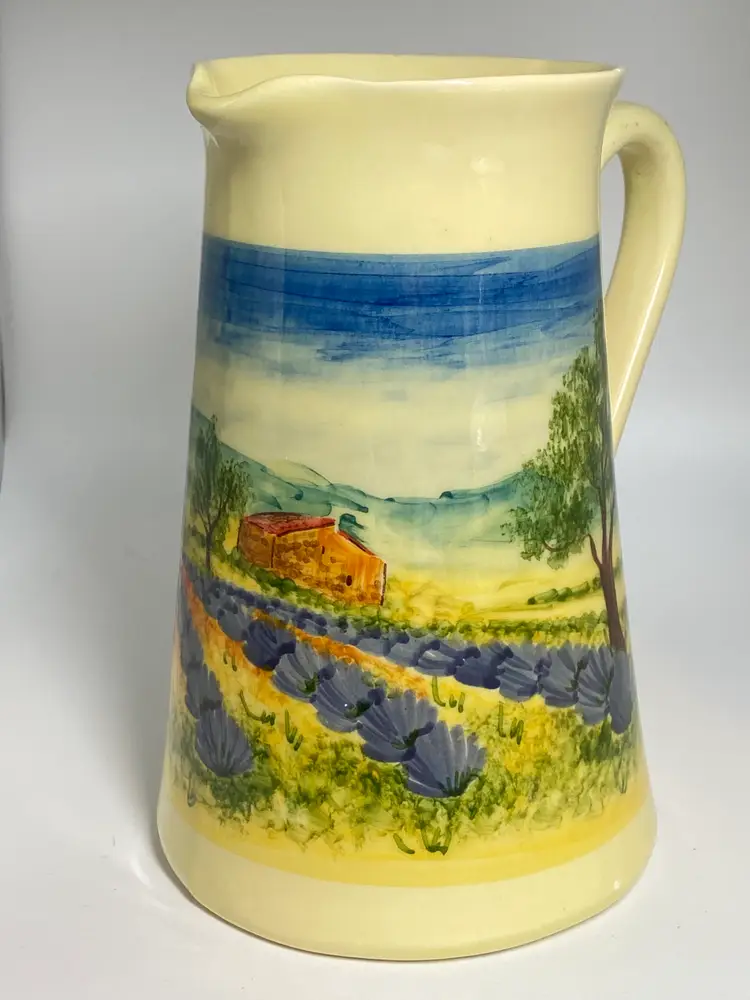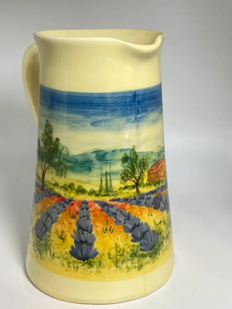 This vintage hand-painted ceramic pitcher by Atelier du Sage Studio is a charming piece of French pottery. Standing at 7 inches tall with a diameter of 4.5 inches, this multicolored pitcher features a glossy finish and weighs 1 pound and 5 ounces. The intricate hand-painted details and art pottery production style make it a unique and decorative addition to any collection. Made in France, this pitcher is a testament to the craftsmanship and creativity of Atelier du Sage Studio.