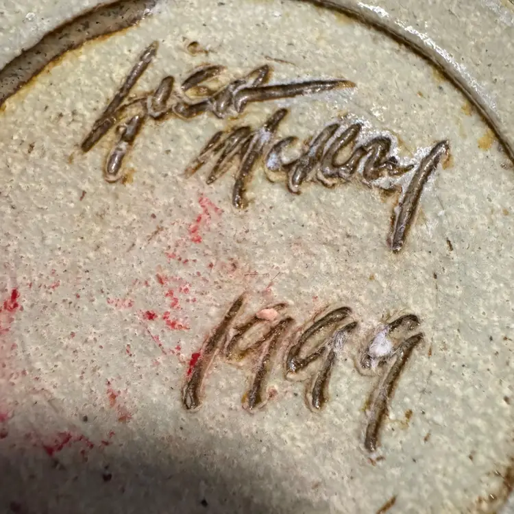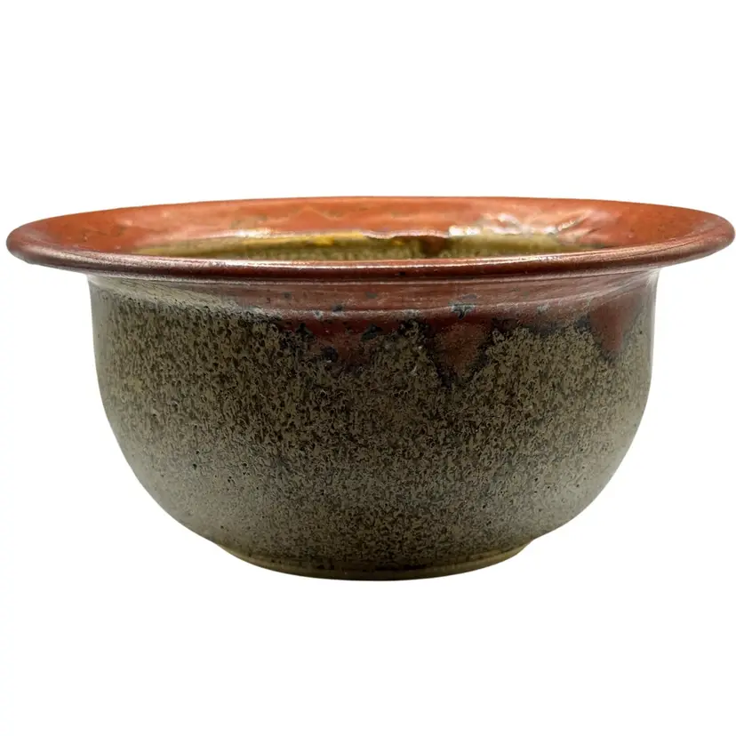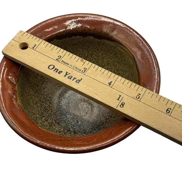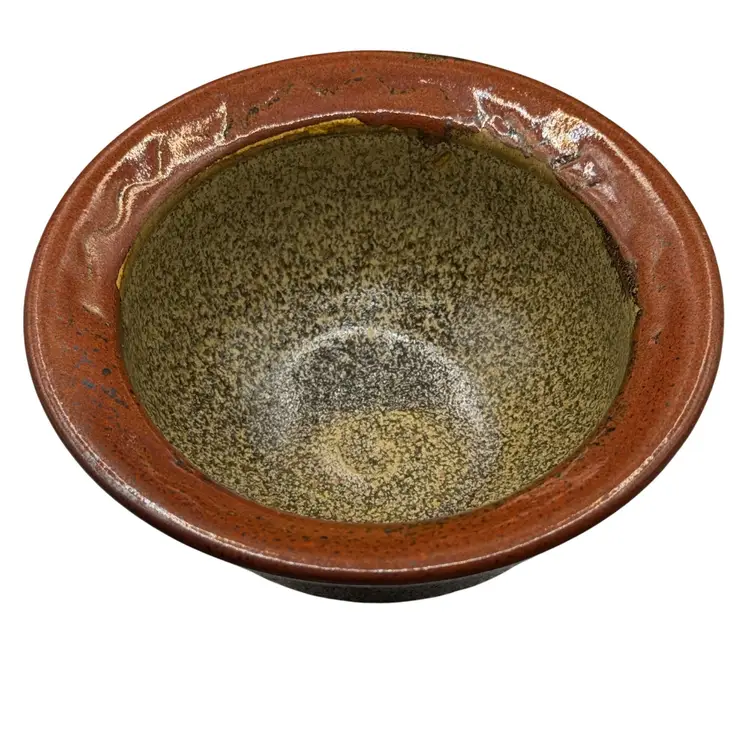 • Handmade pottery bowl • Unique brown and red glaze • Signed by the artist • Dated 1999 • Rustic and earthy design • Measures approx. 5.5 inches in diameter