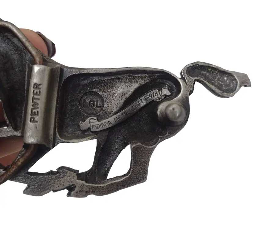 This is a very nice vintage buckle from 1978 of a running horse. This is marked by the maker on the back & is solid pewter. Buckle measures 4" long x 2.25" tall.