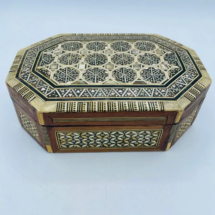 Gorgeous and unique box...handmade in Egypt. Nice octagonal shape and intricate deign. Hinged lid with red velvet lining inside. Lid a bit stiff and doesn't stay open wide...didn't want to push it too much. See all images for more info and details. Other boxes also listed separately. Bin 70