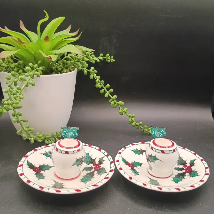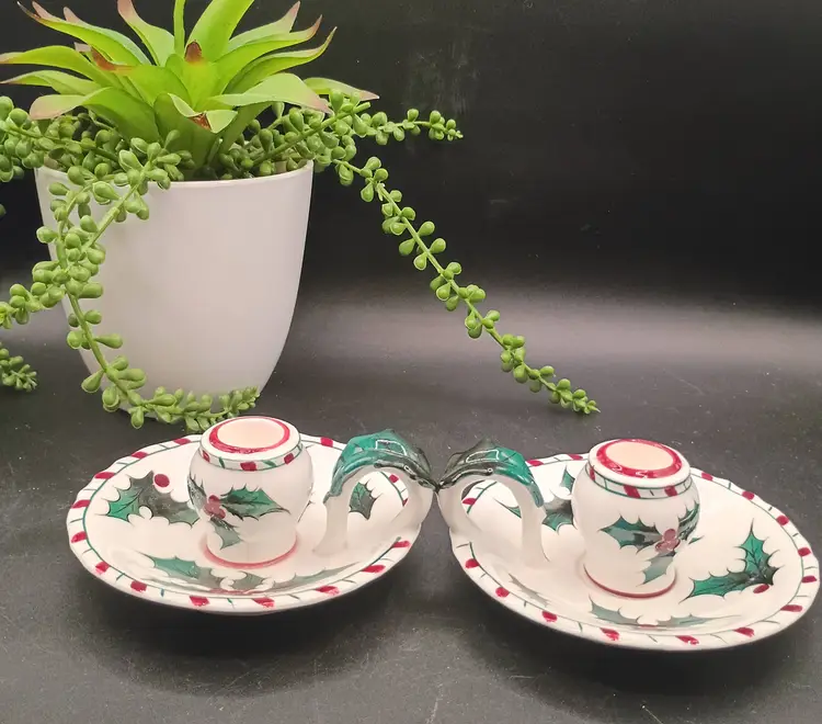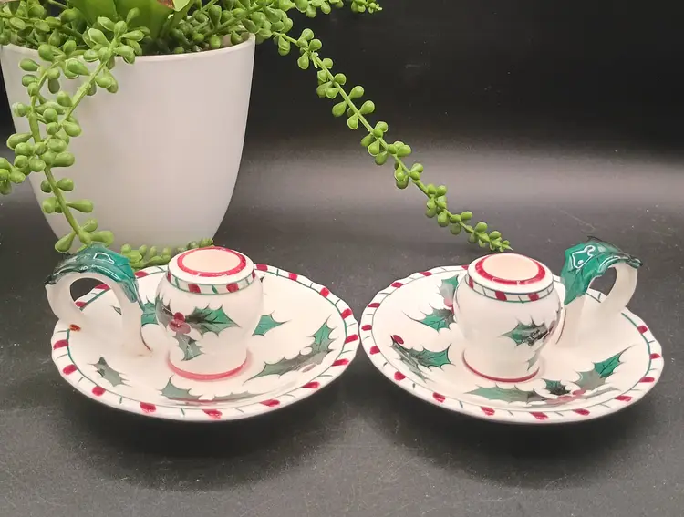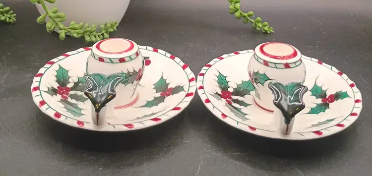Pair of lovely Vintage Lefton Holly Berry & Candy Cane pattern candleholders. It is believed these are from the 1950's.