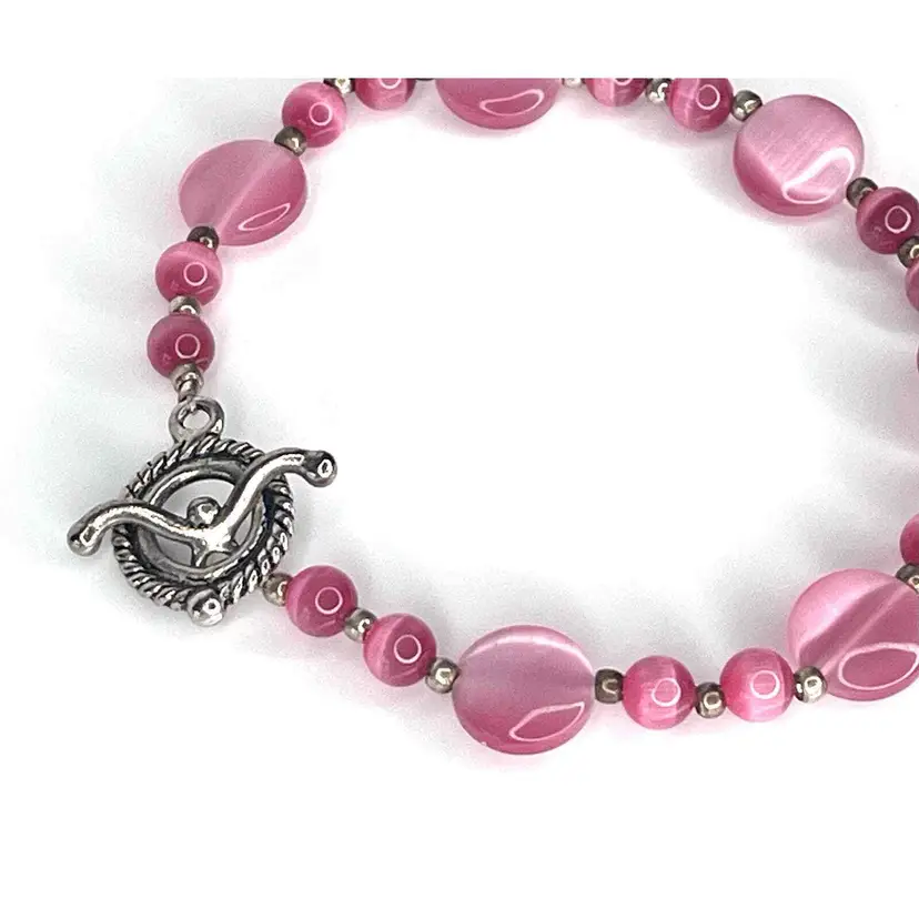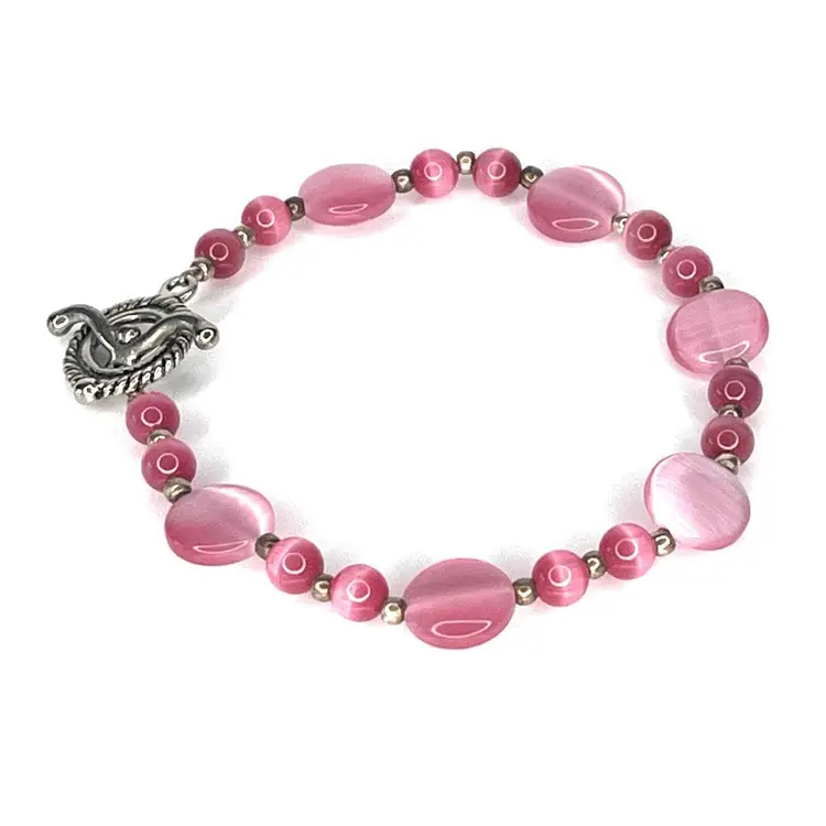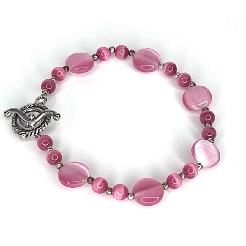 Brand: HandCrafted Color: Pink Occasion: Birthday Main Stone: Tiger's Eye Style: Beaded Main Stone Creation: Unknown Main Stone Width: 11 mm Number of Gemstones: Several Handmade: Yes Vintage: Yes Metal: Silver Type: Bracelet Features: New Condition, Silver Beads, Light Pink Tiger's Eye Beads, Glass Beads Main Stone Color: Pink Closure: Toggle Theme: Beauty Main Stone Shape: Round Item Length: 9 in Setting Style: Beaded Material: Gemstone, Glass