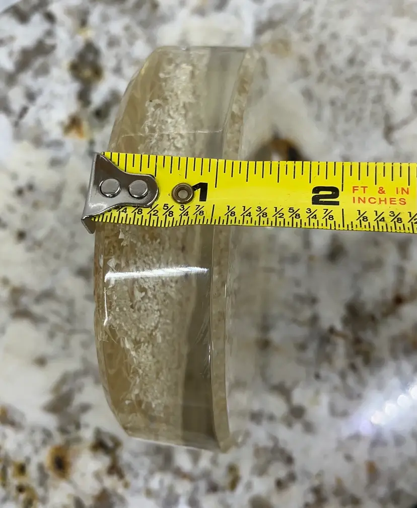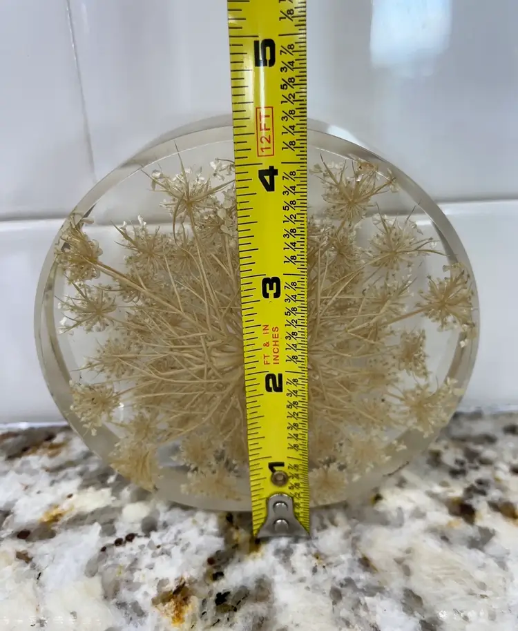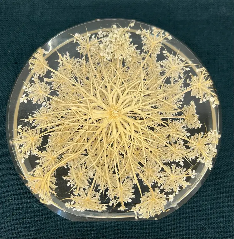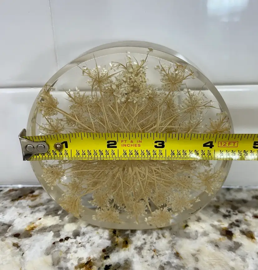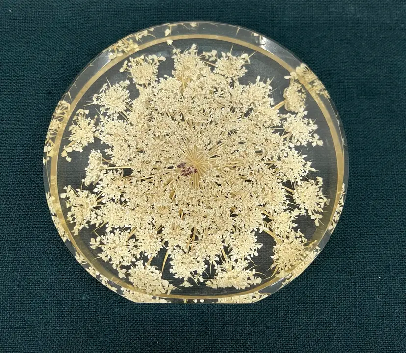 Beautiful dried flowers in lucite stands alone. Both solids are so pretty. 4.5” x 4.5” round stands up w/flat bottom.