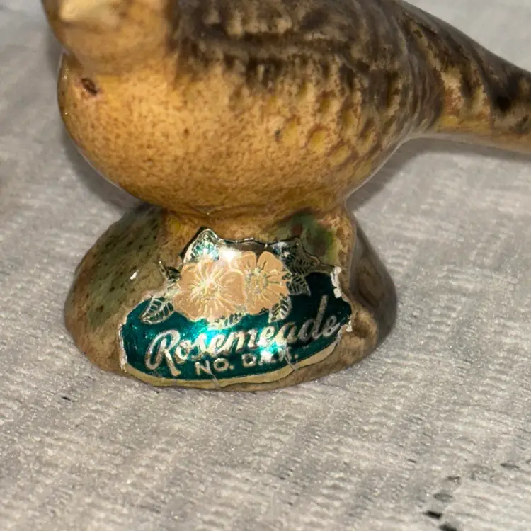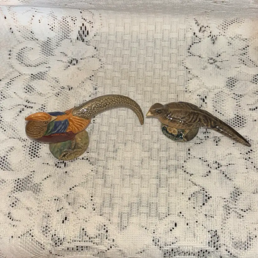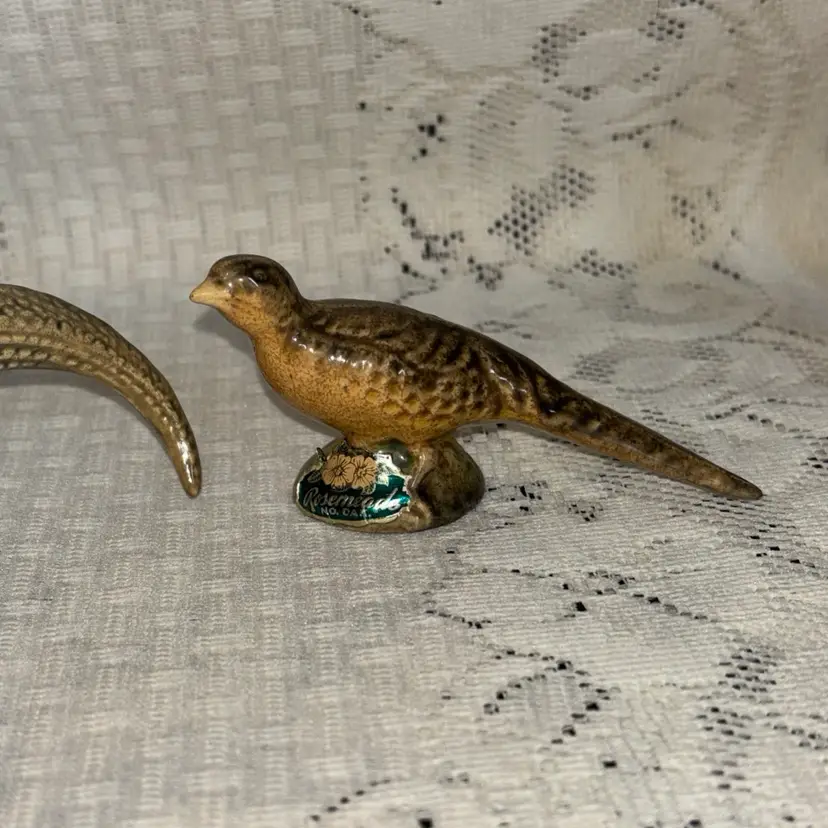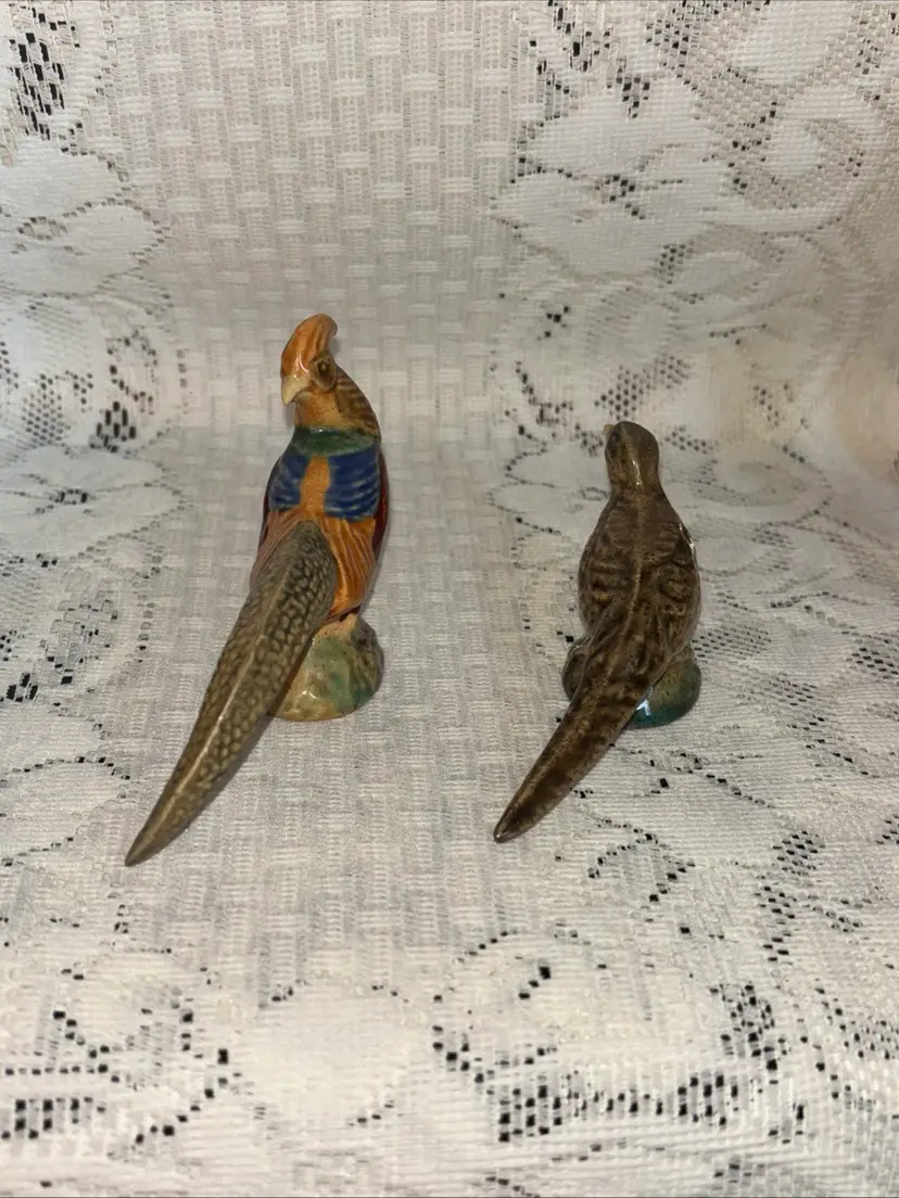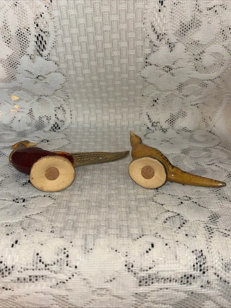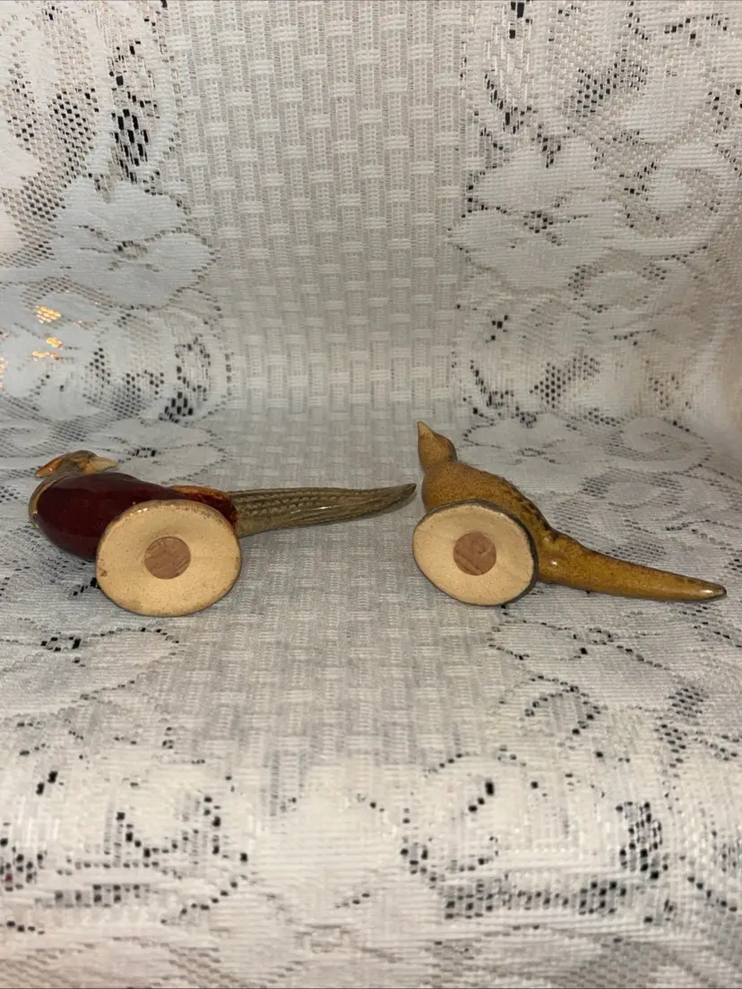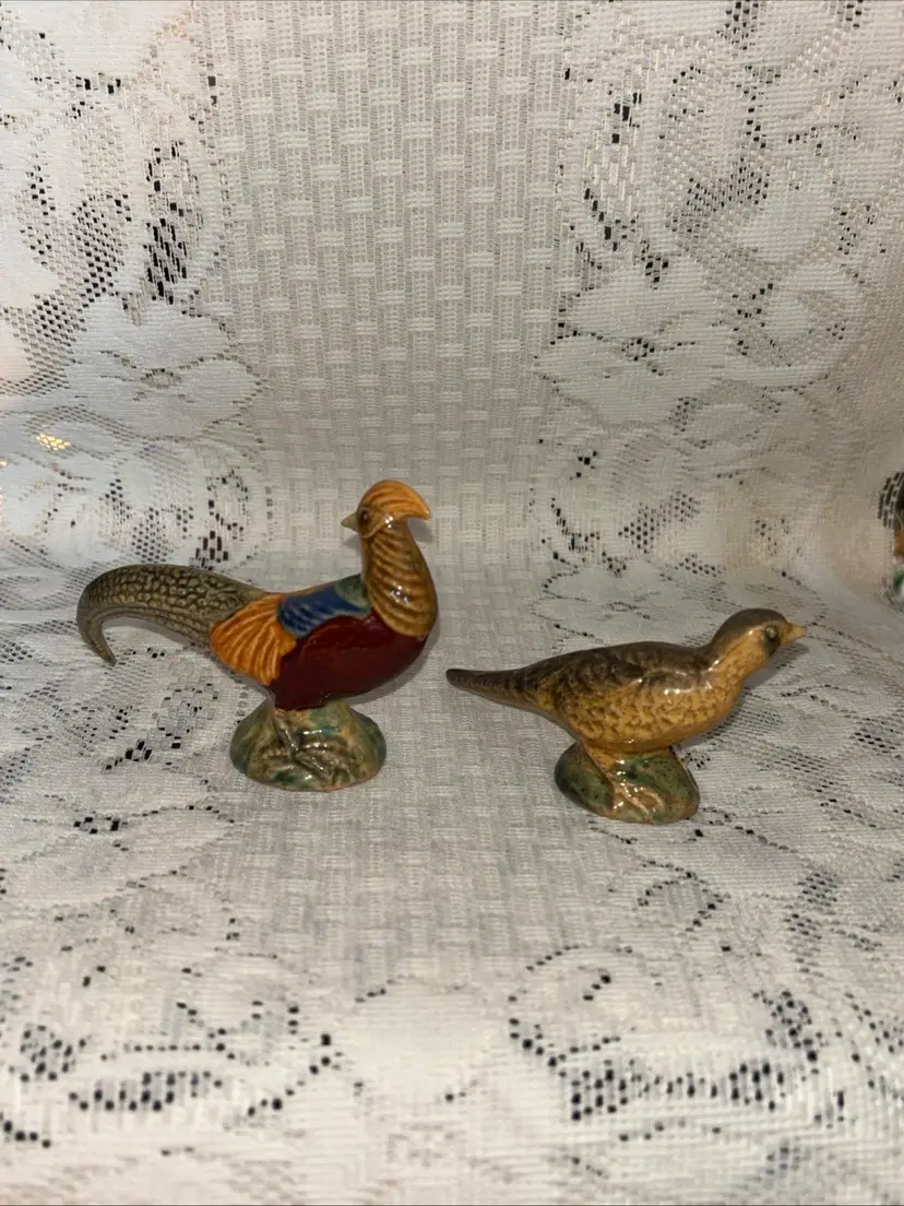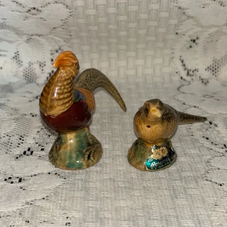 The product is a set of vintage MCM Rosemeade pheasant salt and pepper shakers The set includes two figurines, one of a male pheasant and the other of a female pheasant. These rare and hard-to-find shakers are in excellent condition and would make a unique and decorative addition to any kitchen or dining table. The MCM Rosemeade brand makes these shakers a charming and functional collectible for enthusiasts of vintage kitchen decor.