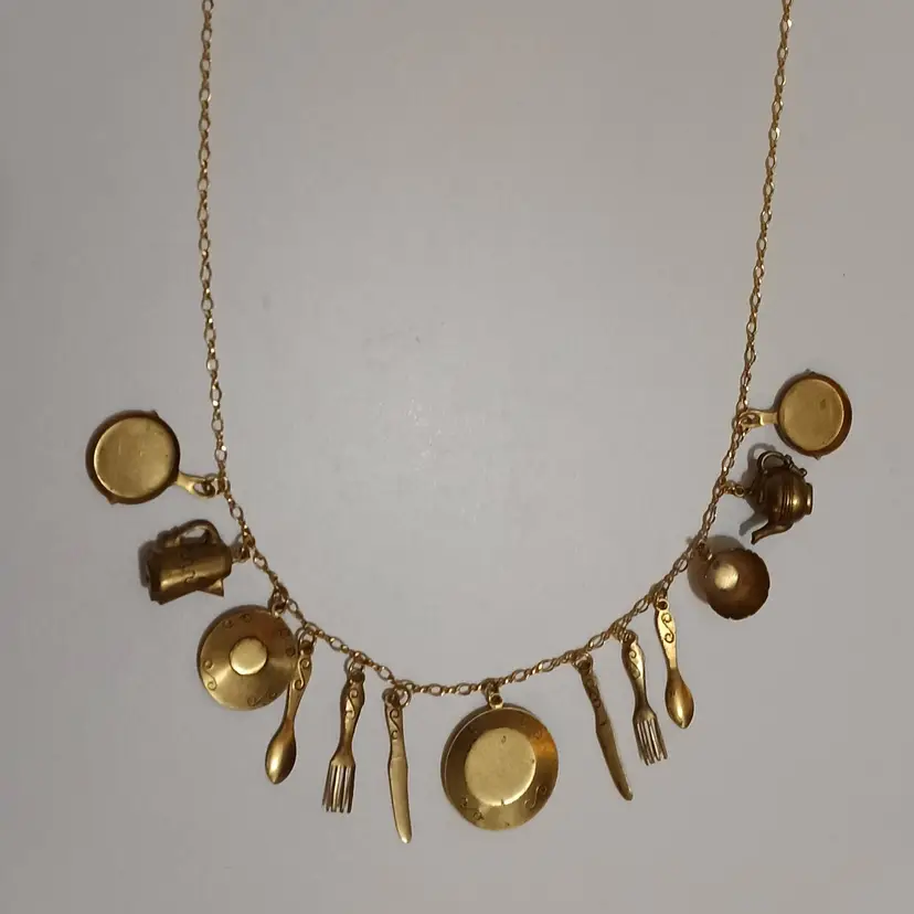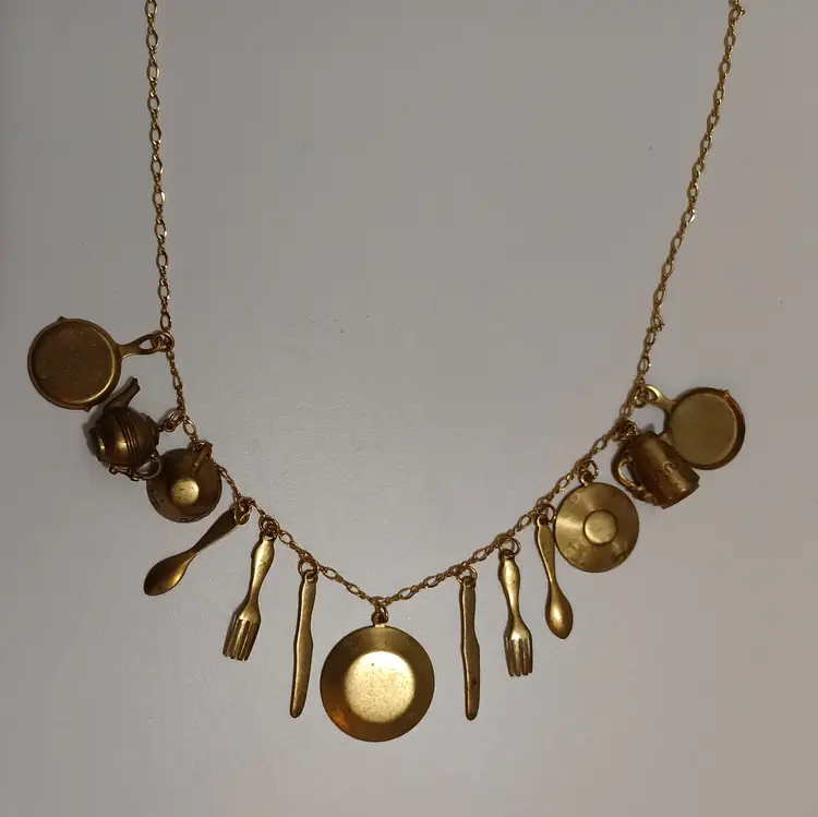 Charming VTG Brass Colored Necklace Holding Everything Needed for A Mini Picnic/Tea/Coffee Party. Adorable Miniature Tea Pot and Coffee Pot with all of the Utensils Too! A true Conversation Piece! 13 Charms; 1" x 1" is the largest charm; necklace measures 25" Total Length