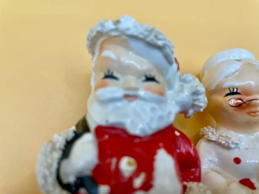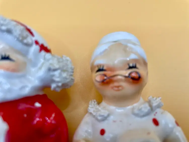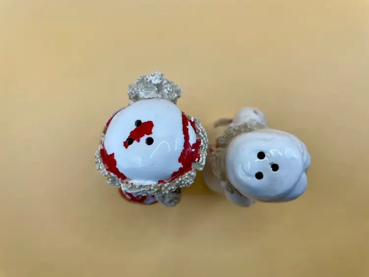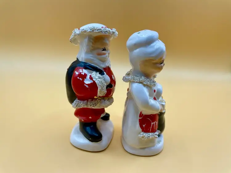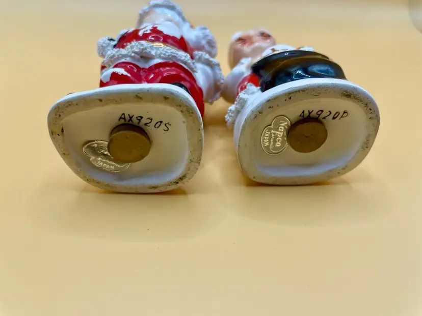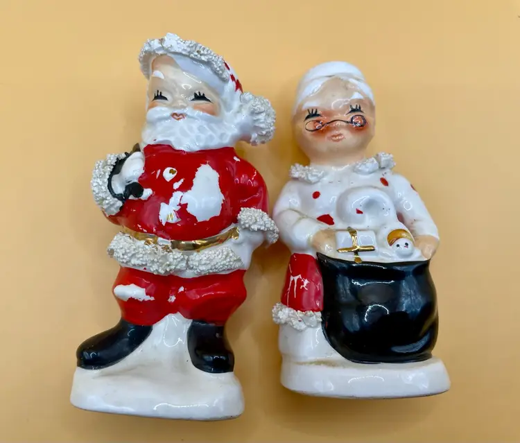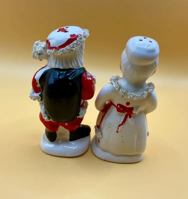 These VTG Napco Santa & Mrs Claus Spaghetti Trim Salt & Pepper Shakers are a charming addition to any kitchen or holiday table setting. Made of ceramic and standing at 3.5 inches tall, they feature a festive design with Santa and Mrs. Claus, perfect for Christmas celebrations. The multicolor shakers from the 1950s come in a set of two, including a pepper shaker and a salt shaker, adding a touch of nostalgia to your kitchen décor. Imported from Japan, these original seasonal collectibles are sure to bring some whimsy to your dining experience.