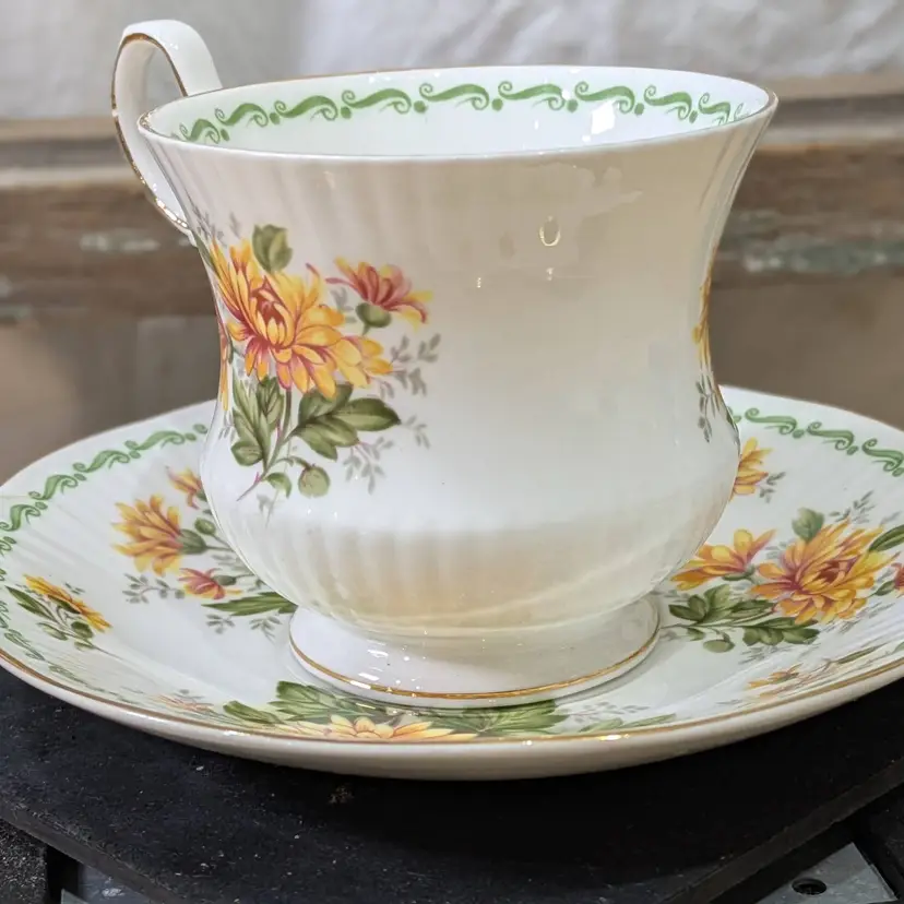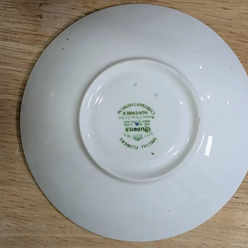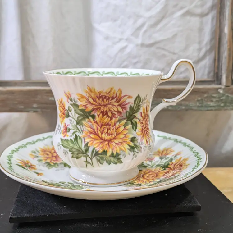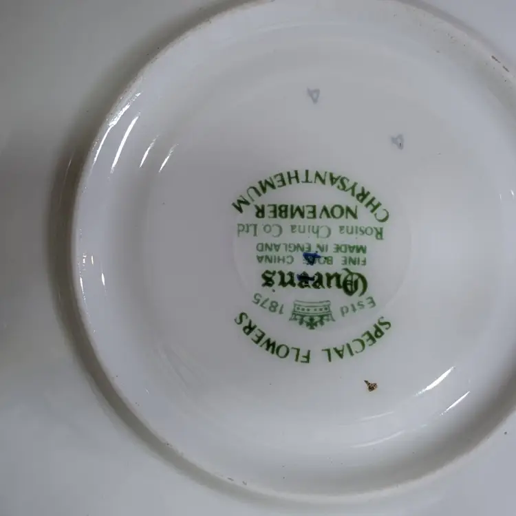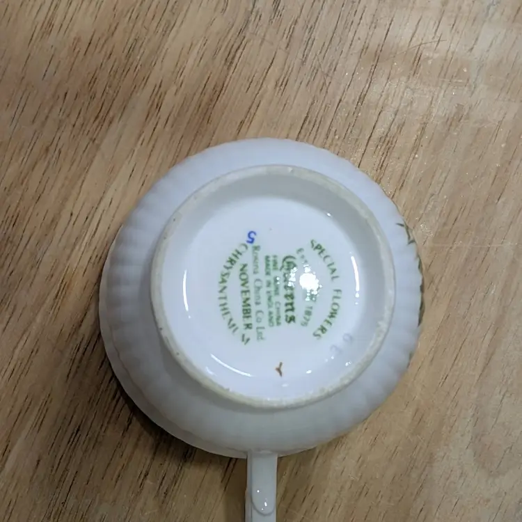 Dimensions: Cup: 2 3/8" height x 2.75" top diameter Saucer: 5" diameter This demi cup and saucer set made by Rosina Queens features the Special Flowers design pattern, this set being for November with yellow Chrysanthemums. This item has been previously owned and is in very good condition with little or no signs of use or wear.