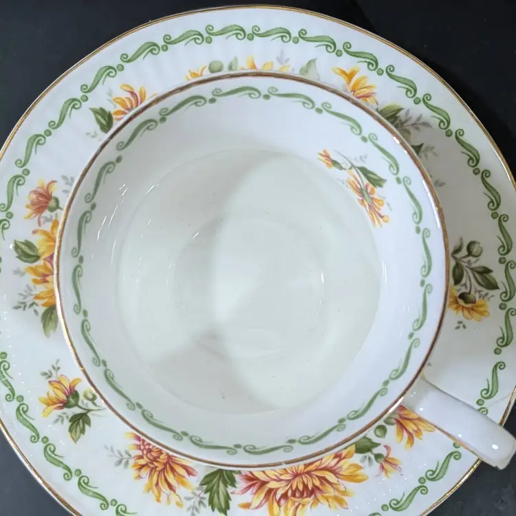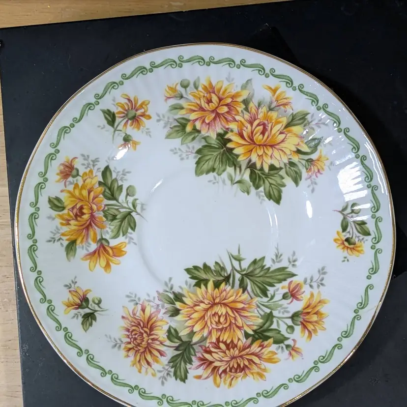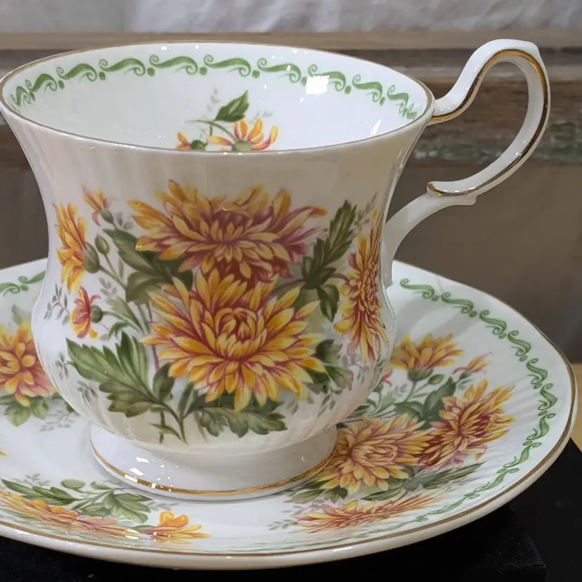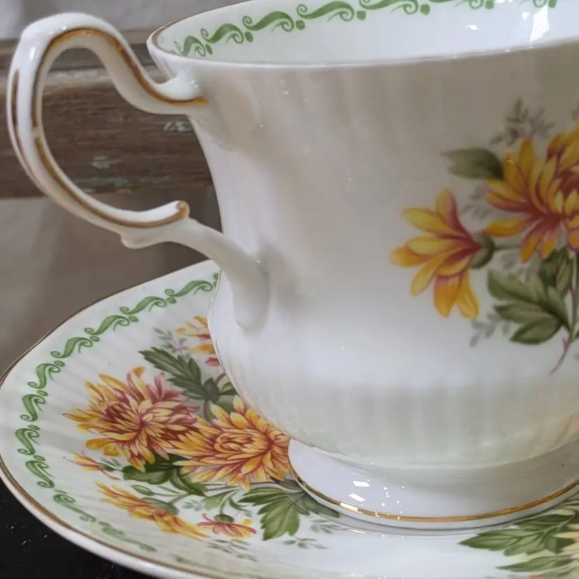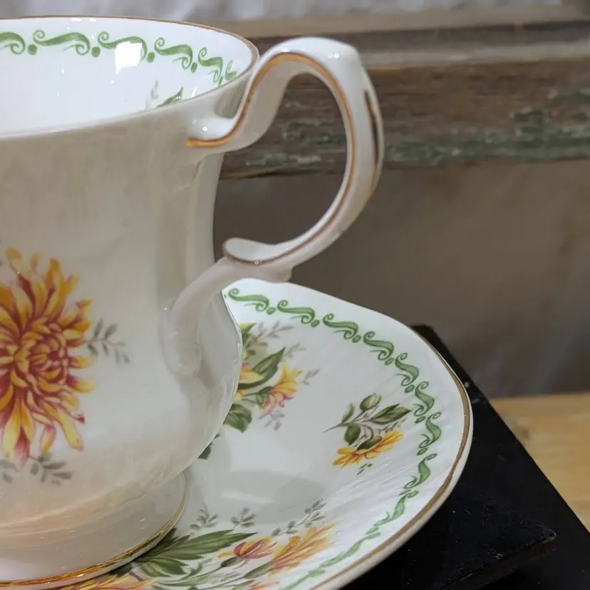 Dimensions: Cup: 2 3/8" height x 2.75" top diameter Saucer: 5" diameter This demi cup and saucer set made by Rosina Queens features the Special Flowers design pattern, this set being for November with yellow Chrysanthemums. This item has been previously owned and is in very good condition with little or no signs of use or wear.