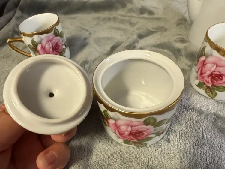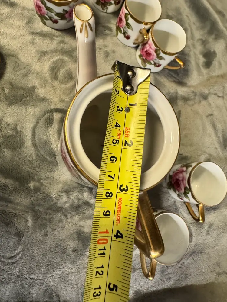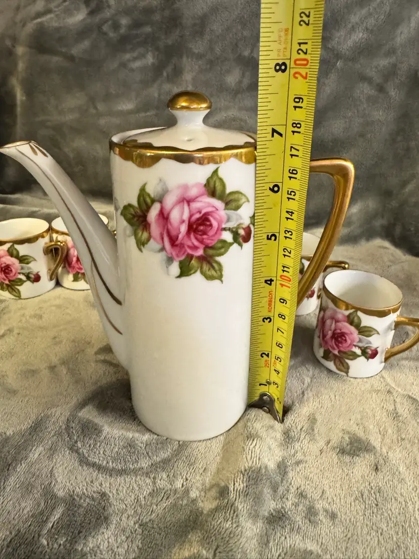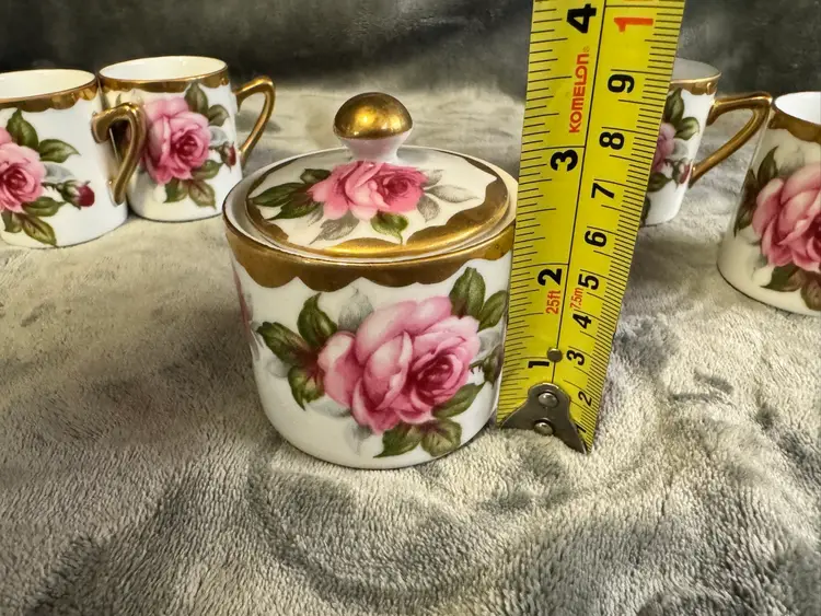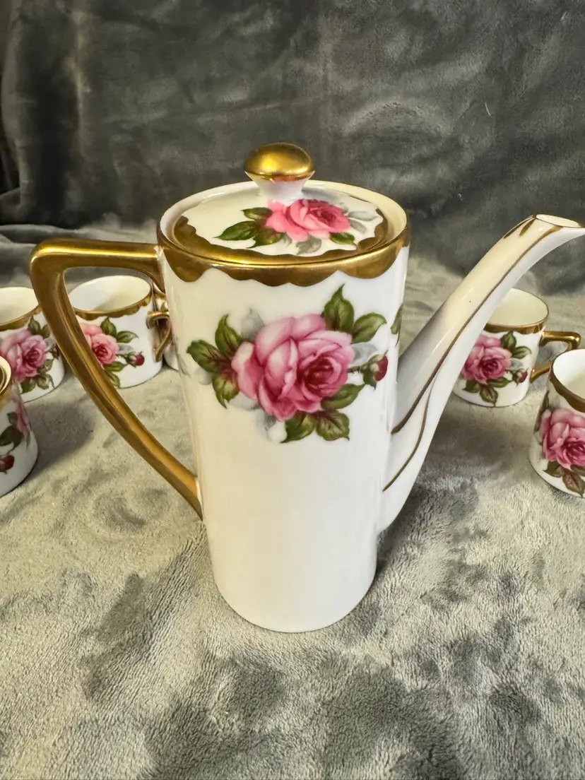 The VTG Set of 7 Andrea By Sadek Japan Tea Set features a vintage design from the 1960s, with a beautiful pink rose pattern and gold accents. This tea set includes a teapot with lid, 5 cups, a sugar bowl with a lid, all made of porcelain. The Victorian style and flower theme make it a charming addition to any collection or dining table, with the teapot standing at 7.5" in height.