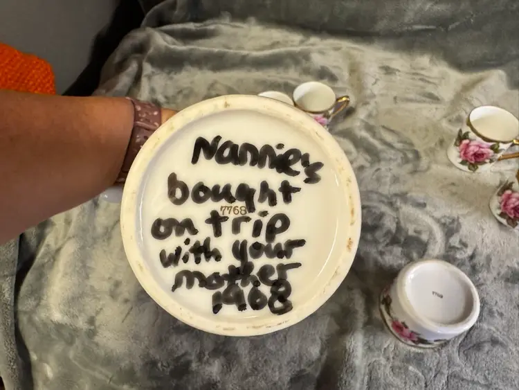 Handwritten note on the bottom says, “Nanny bought on a trip with your mother in 1968.”