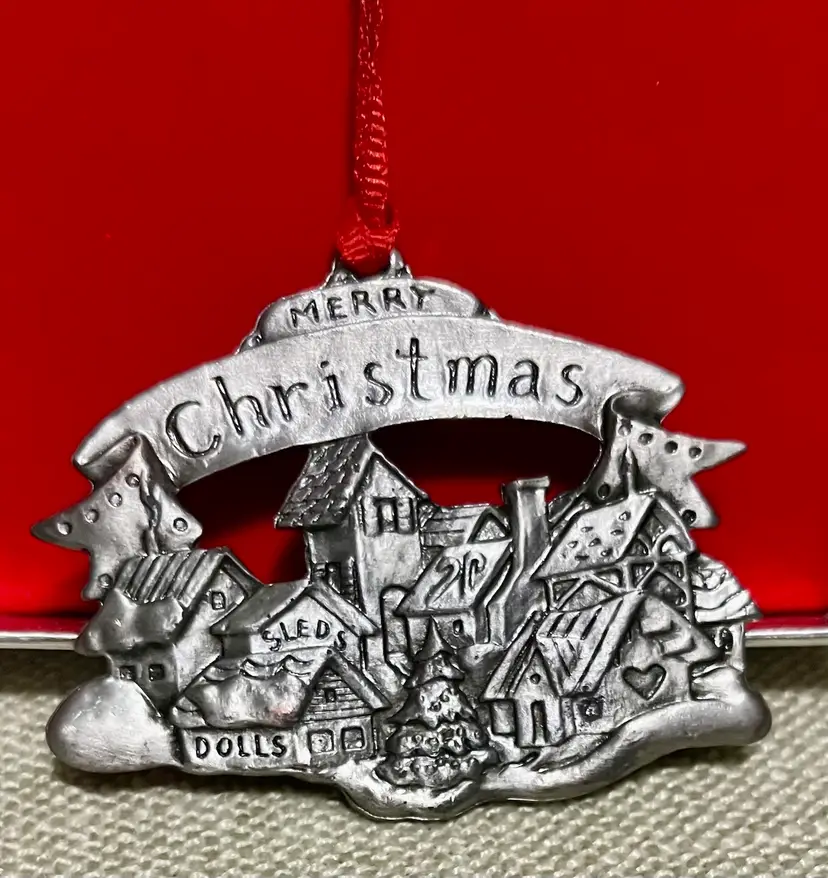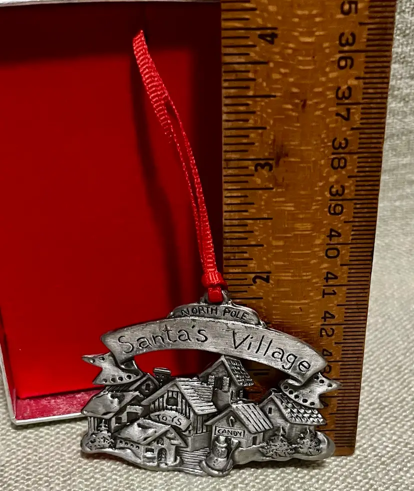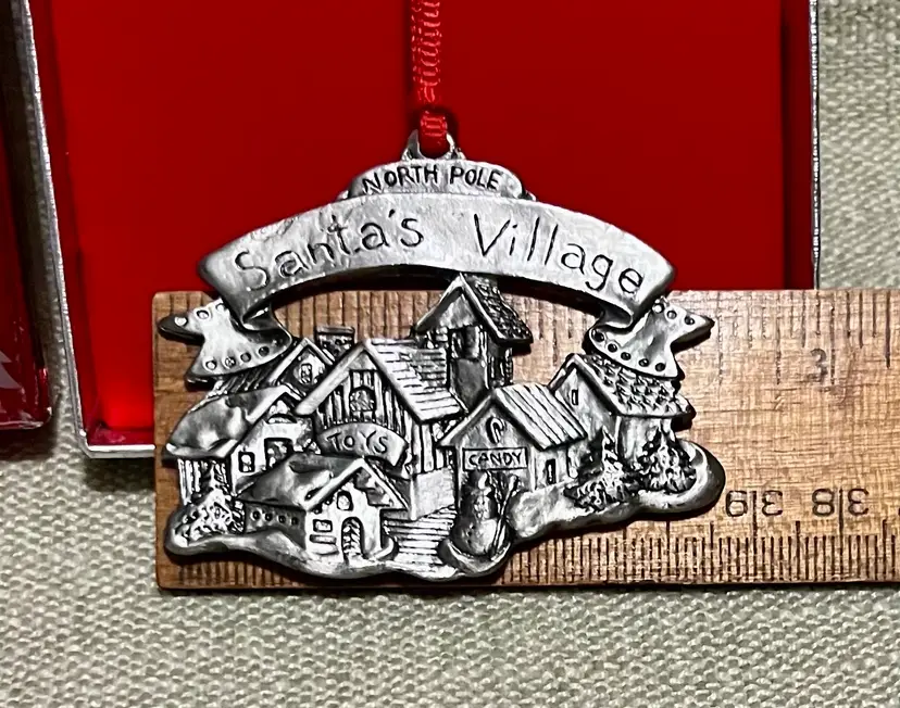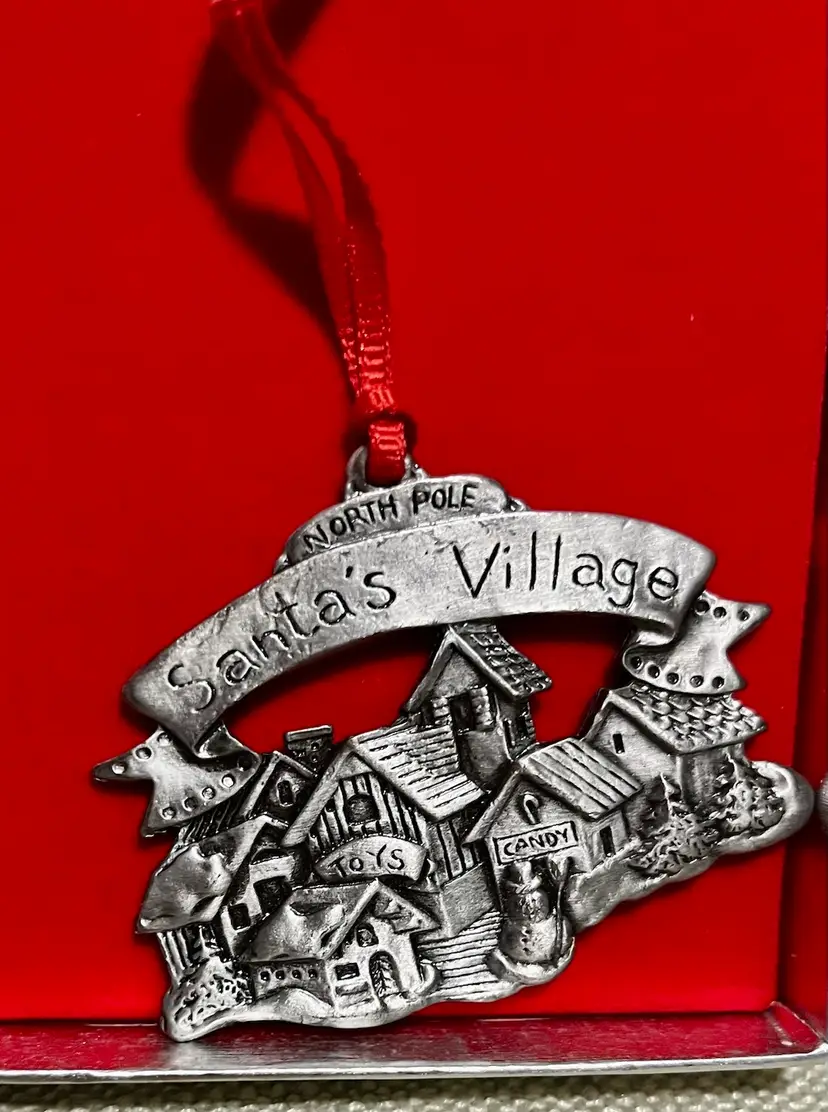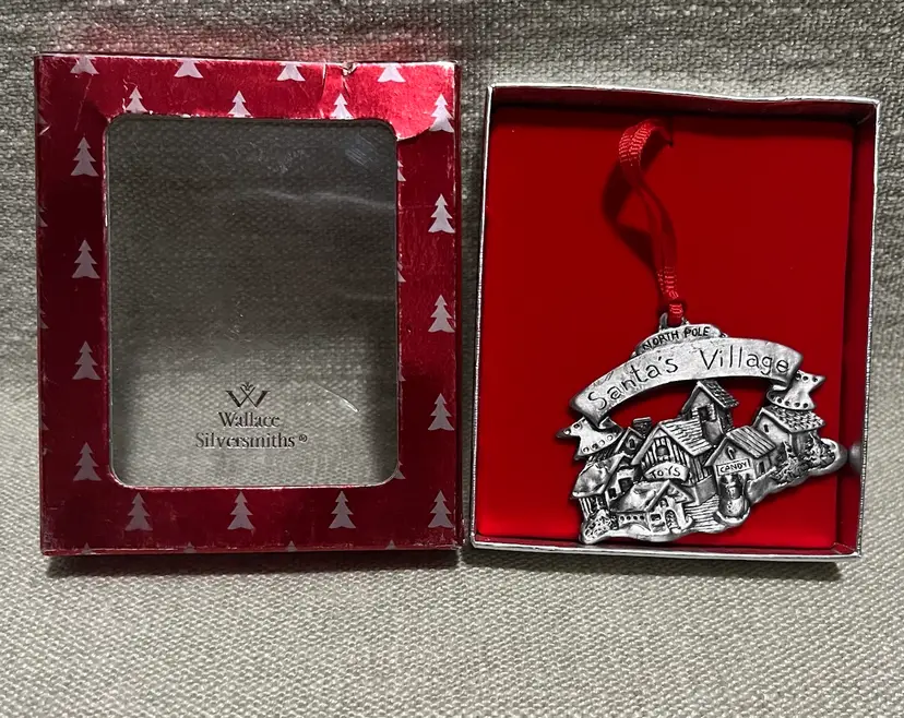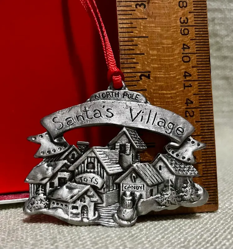 This vintage Wallace Silversmith Christmas Village 2-sided ornament features a “carved-like” appearance on each side. This one-piece ornament from Taiwan weighs 2.7 ounces and measures under 2 inches in height and less than 3 inches in width, making it a charming and whimsical addition to the tree, a gift topper, or a mantle or wreath, highlighting the theme of Santa's Village North Pole.