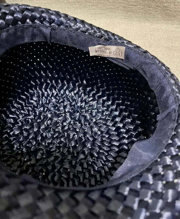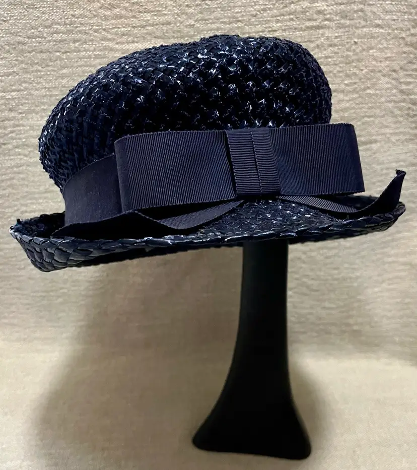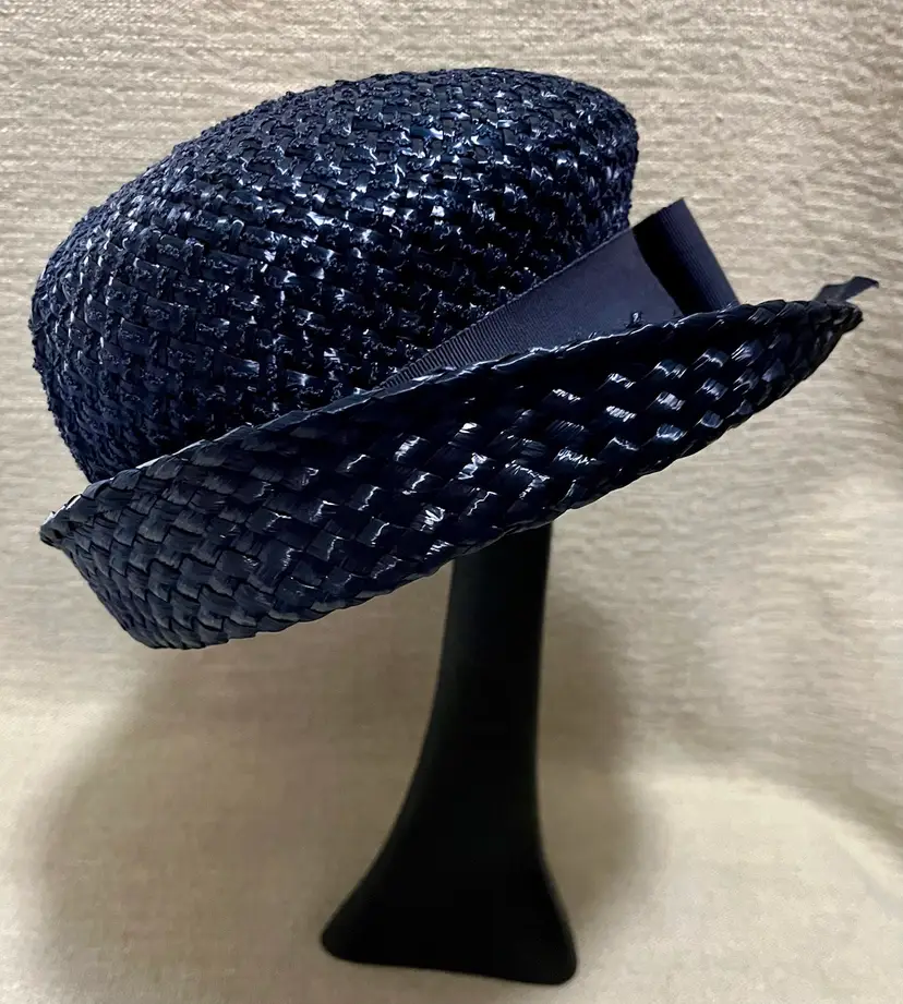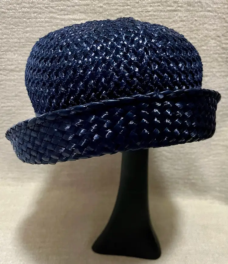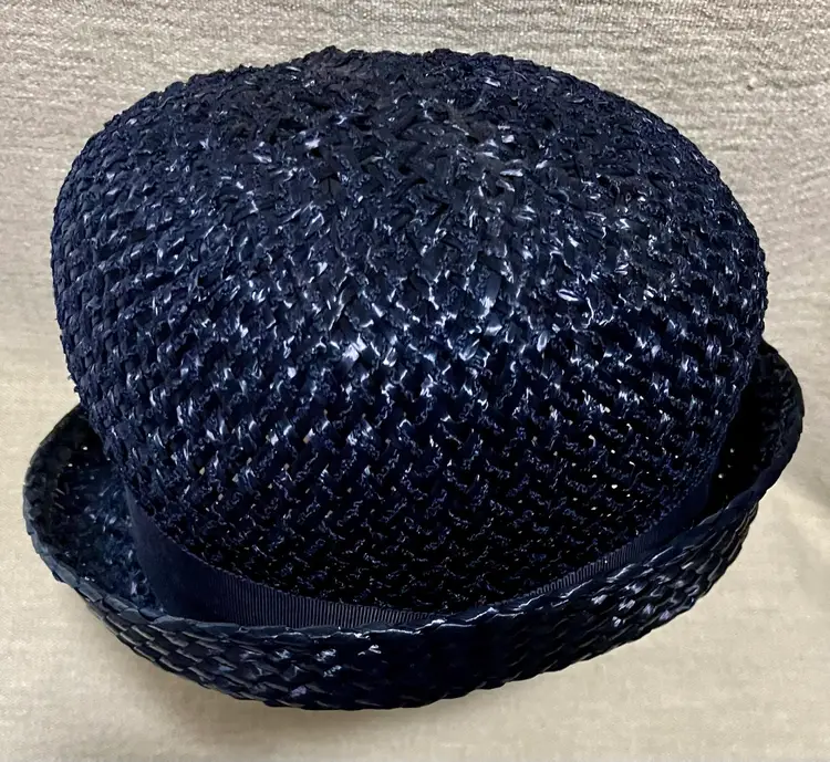 This vintage women's cloche tea party hat is a charming accessory perfect for special occasions. Made in the United States during the 1950s-1960s era, this navy blue hat features a woven cellulose straw design with grosgrain accents. The one-size-fits-all design adds a touch of elegance to any outfit, making it a wonderful addition for those who appreciate classic vintage style.