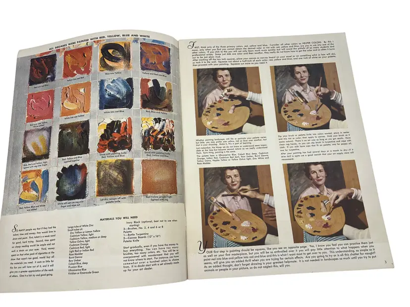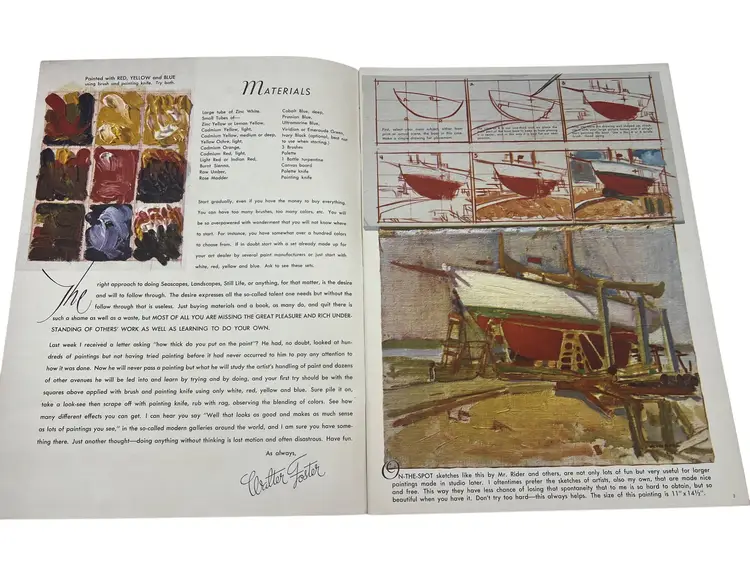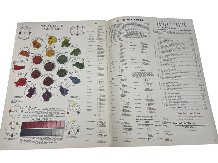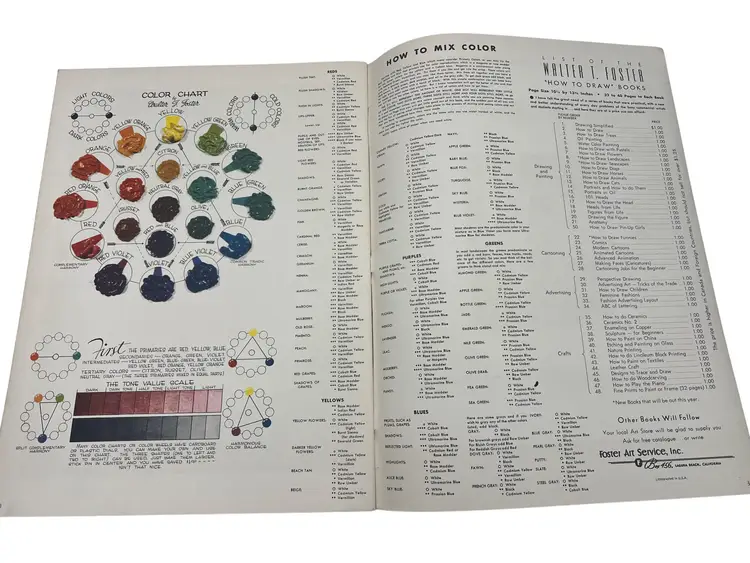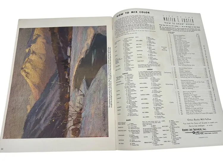 Lot of three vintage Walter T. Foster oversize art instruction books: Flowers (No. 7), Landscapes (No. 8), and Seascapes. Each measures about 13.75" x 10.25" and features full-page demos, palettes, and the well-known “How to Mix Color / Color Chart” spread (pp. 30–31). Great mid-century studio references and display pieces.