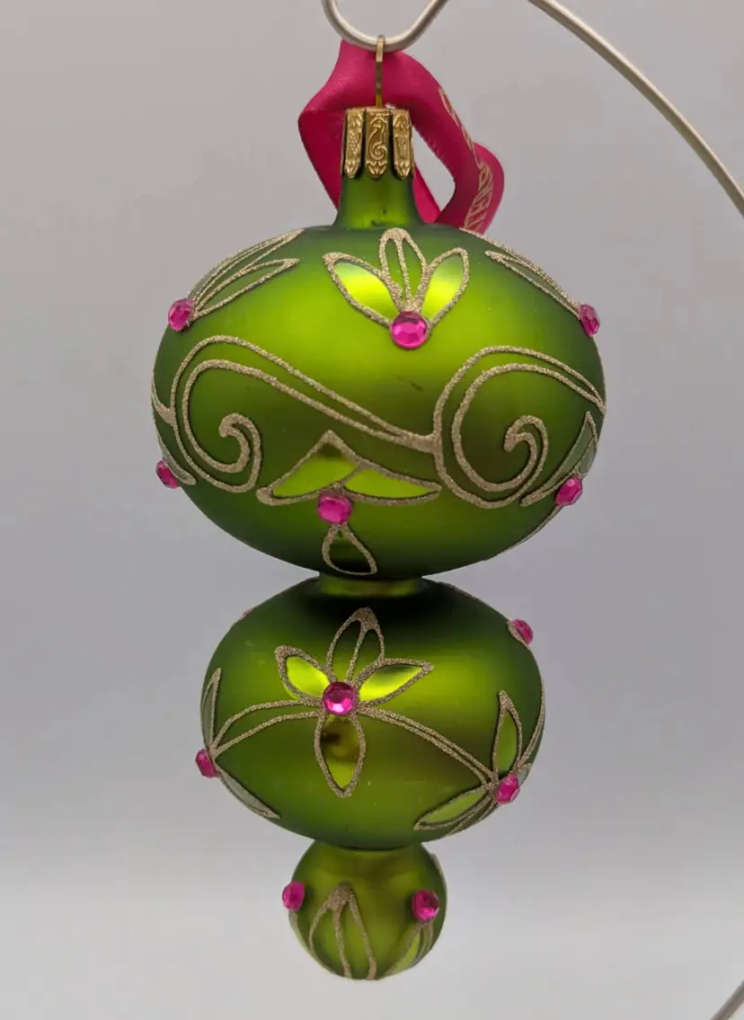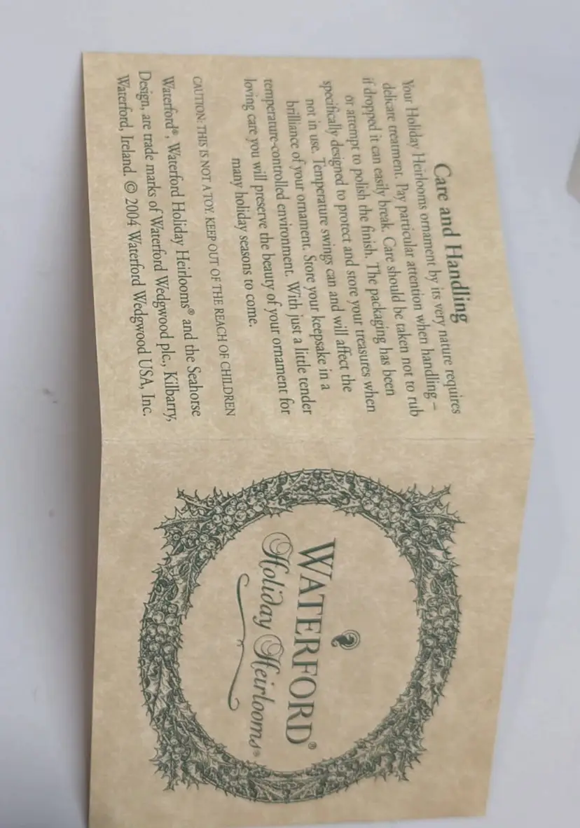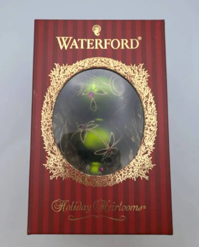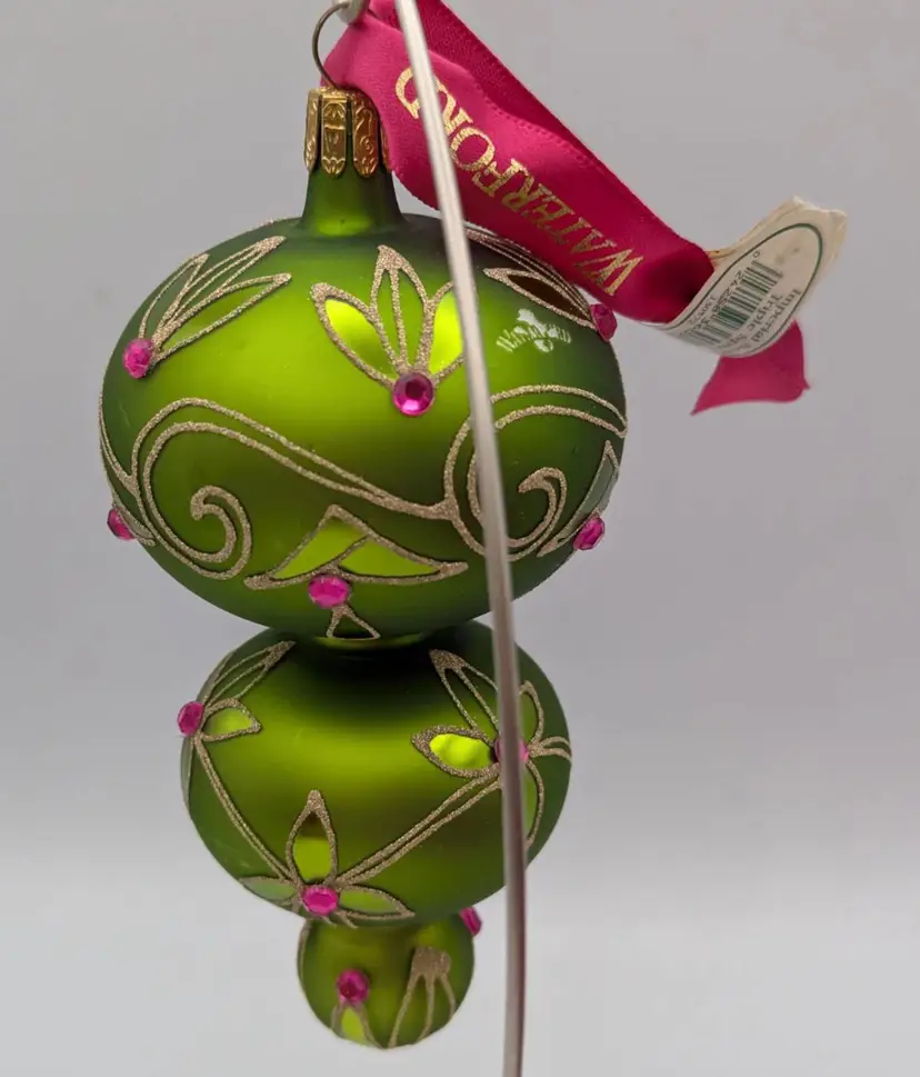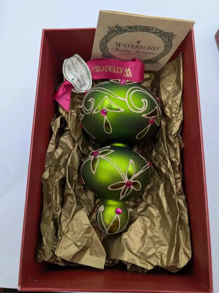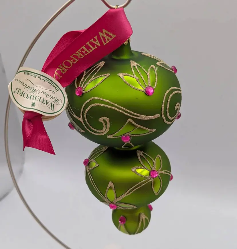 Waterford Holiday Heirloom Imperial Scroll Triple Green Spire Ornament This is truly a beautiful ornament. Noted to be a Holiday Heirloom. I tried to capture its beauty- I have it on stand- stand not included. Measures: Approx. 5.5 inches in length Original box- Comes with all original tag, ribbon and note card of information There is a photo that shows the waterford mark. Made in Romania. This is being sold as used- it was hung for several seasons. Downsizing. No chips, cracks or wear. In truly wonderful preowned condition. Non smoking home Non pet home