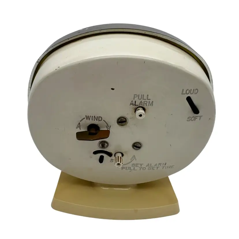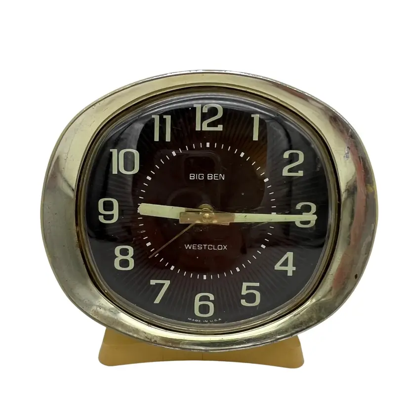Classic late-1970s/1980s Westclox Big Ben Style wind-up alarm clock. Cream plastic case with gold-tone bezel and a brown dial with luminous numerals and hands. Rear controls include wind, loud/soft selector, and alarm and time set stem. Approx. 5" tall. A clean, displayable example of the rounded “pillow” case Big Ben that followed Style 8 and preceded the later quartz variants. Made in USA.