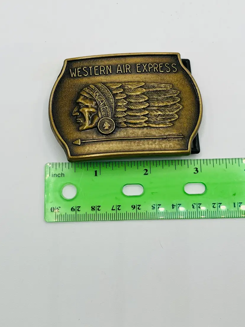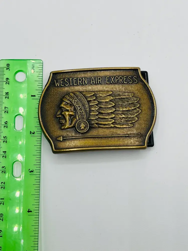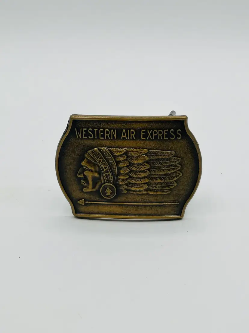 The Western Air Express Belt Buckle is a vintage accessory featuring a bronzed cast metal design of an Indian Chief. Made of brass in the United States, this original belt buckle by WESTERN AIR is a unique and collectible piece with a Native American theme. Perfect for adding a touch of history and nostalgia to any outfit, this belt buckle embodies the spirit of the West and its indigenous people.
