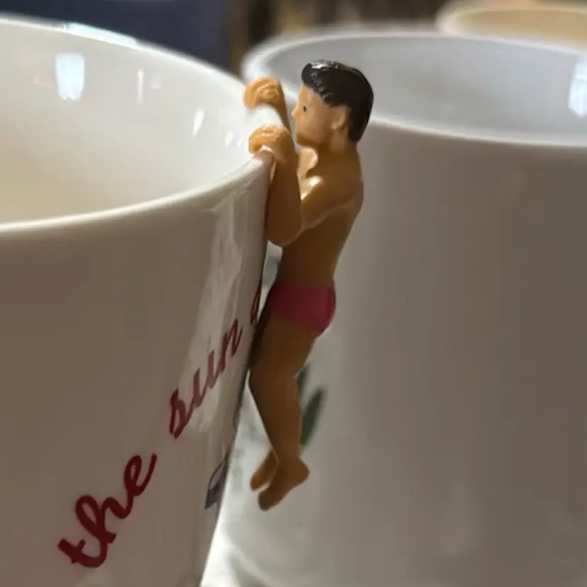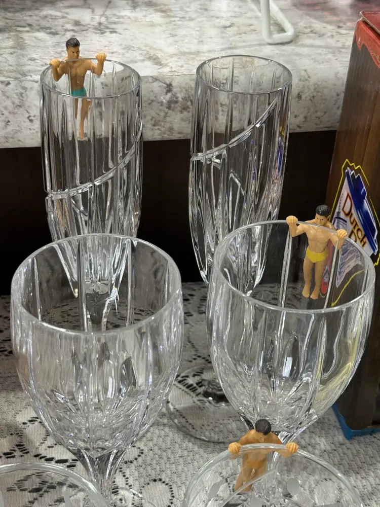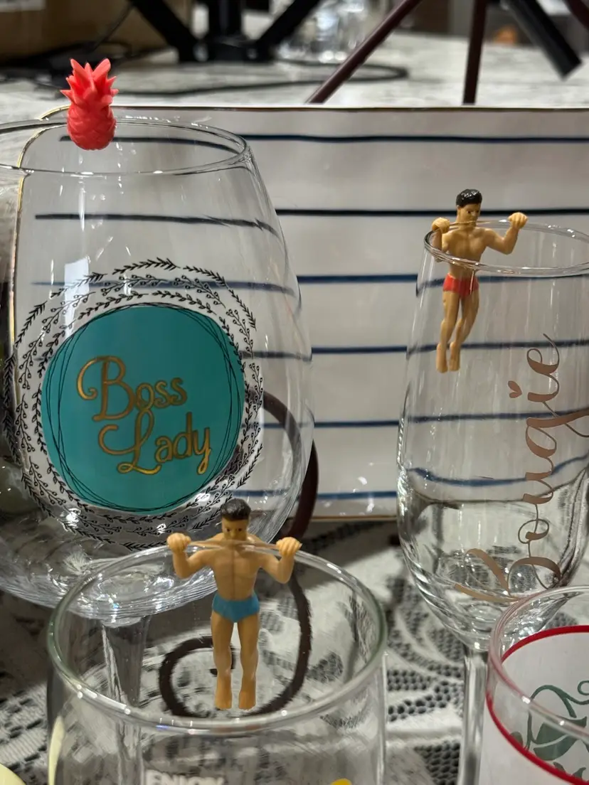 Set of 6 wine glass charms, each with a man’s name on the back of their trunks to help you keep track of your glass! About 2 inches tall, they hang from the glass with curved hands, best for thinner rimmed glasses. Made of a pliable material.