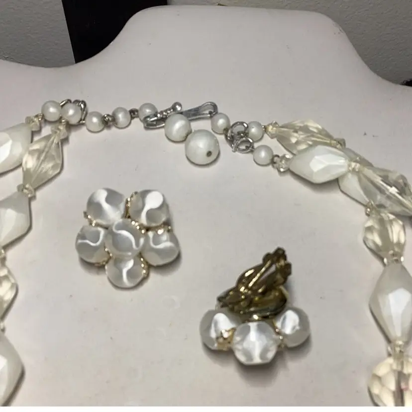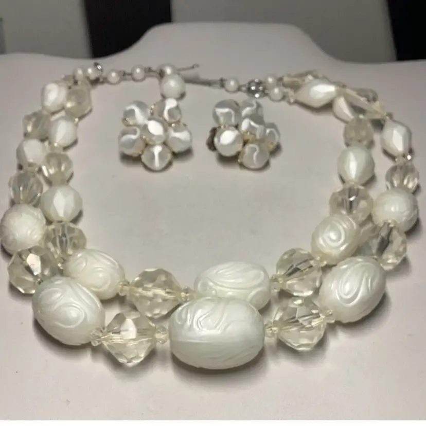 White Double Necklace Plastic Beads Germany & White Earrings Signed Japan Married Set