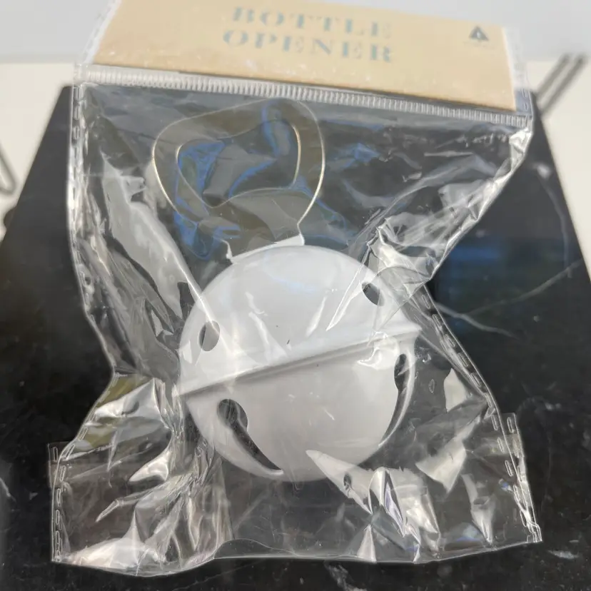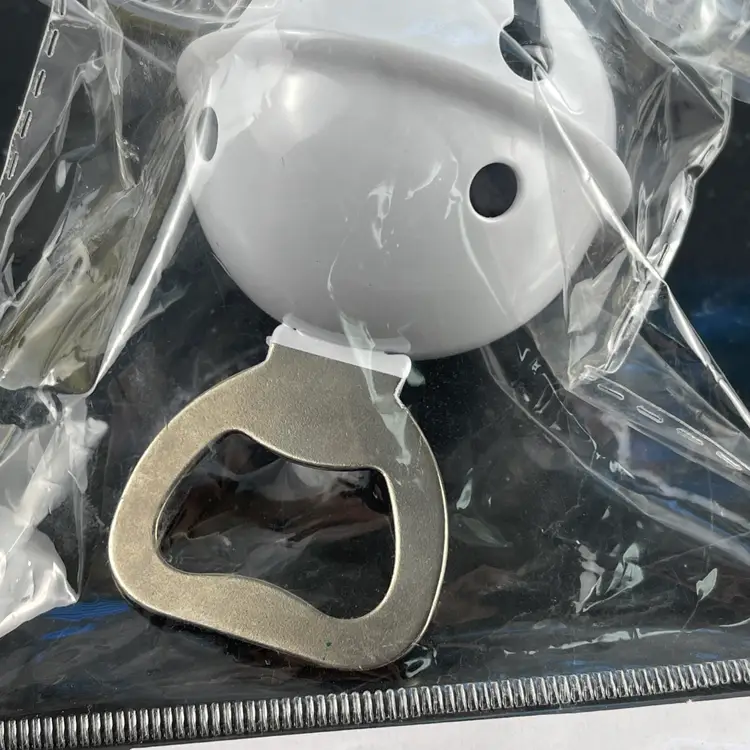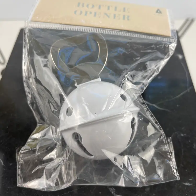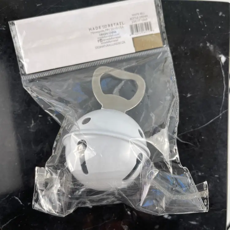 The White Jingle Bell Bottle Opener is a stylish addition to your holiday bar setup. This 4" handheld bottle opener features a festive Christmas design, making it perfect for getting your guests' drinks open during the holiday season. The white metal material adds a touch of elegance, while the jingle bell detail adds a playful element to the table. Made in China, this new in package bottle opener is sure to impress your guests and make your barware more fun and festive.