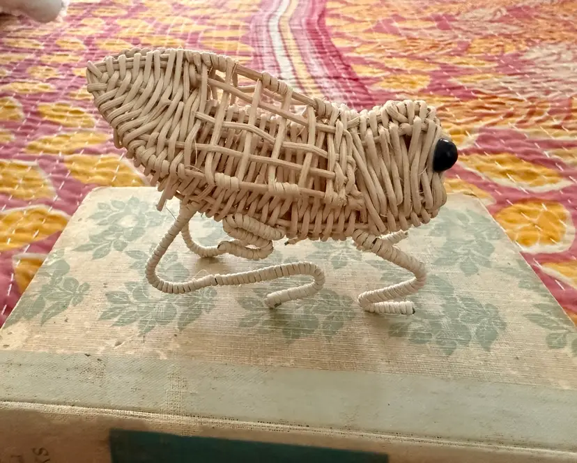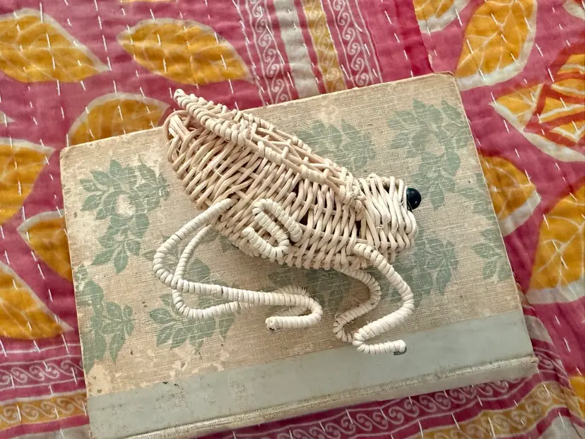 Adorable wicker grasshopper. Legs can be adjusted as needed. 4” long, 2” wide, 3.5” high