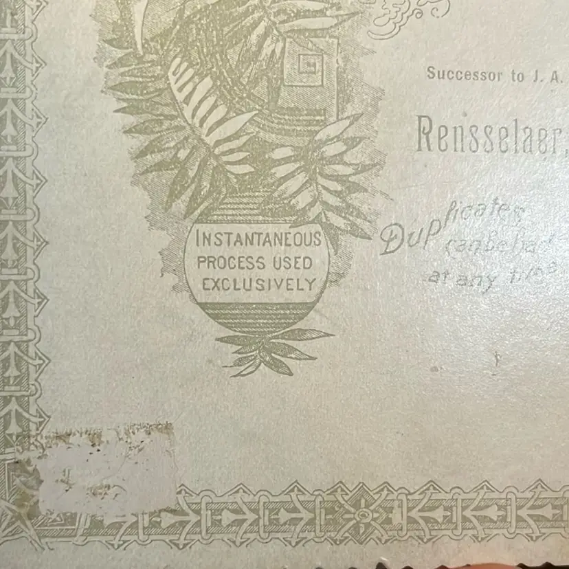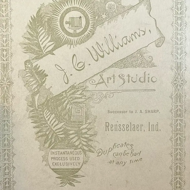 Antique cdv with mustached gentleman in front of backdrop. Gold detail around edges of card. Small tear in paper from a previous sticker I assume. Has some vintage wear at corners and aging throughout. Card measures 4.25” x 6.5”