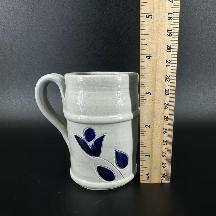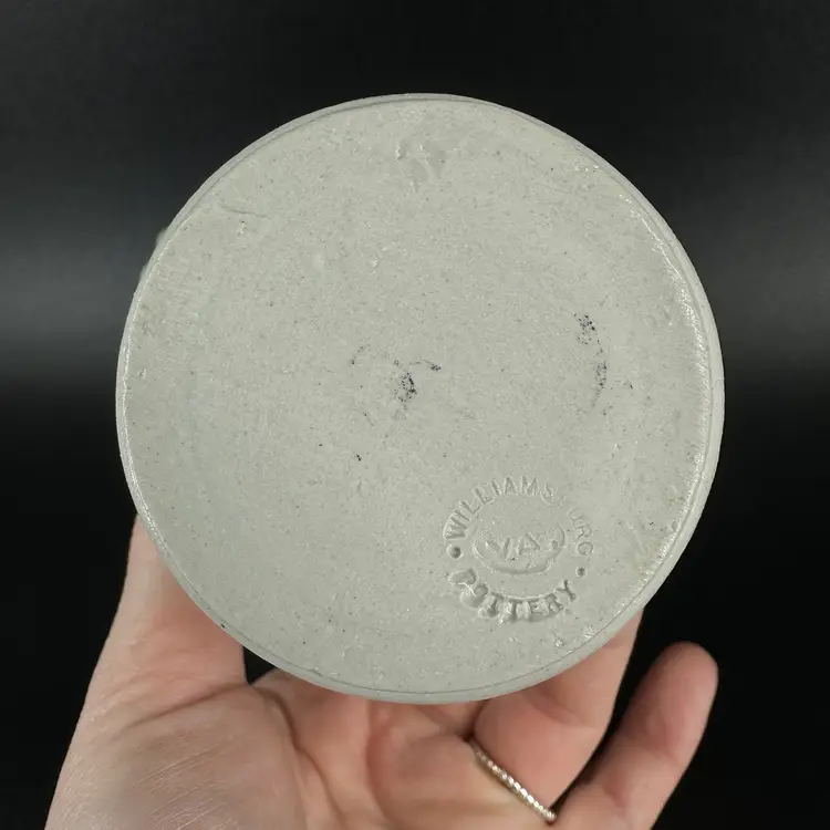 This pitcher is handmade by Williamsburg Pottery and features a cobalt blue flower detail. There are no chips or cracks on the pitcher. Williamsburg VA Pottery logo is stamped on the bottom. Pitcher measures approximately 3.5” tall.