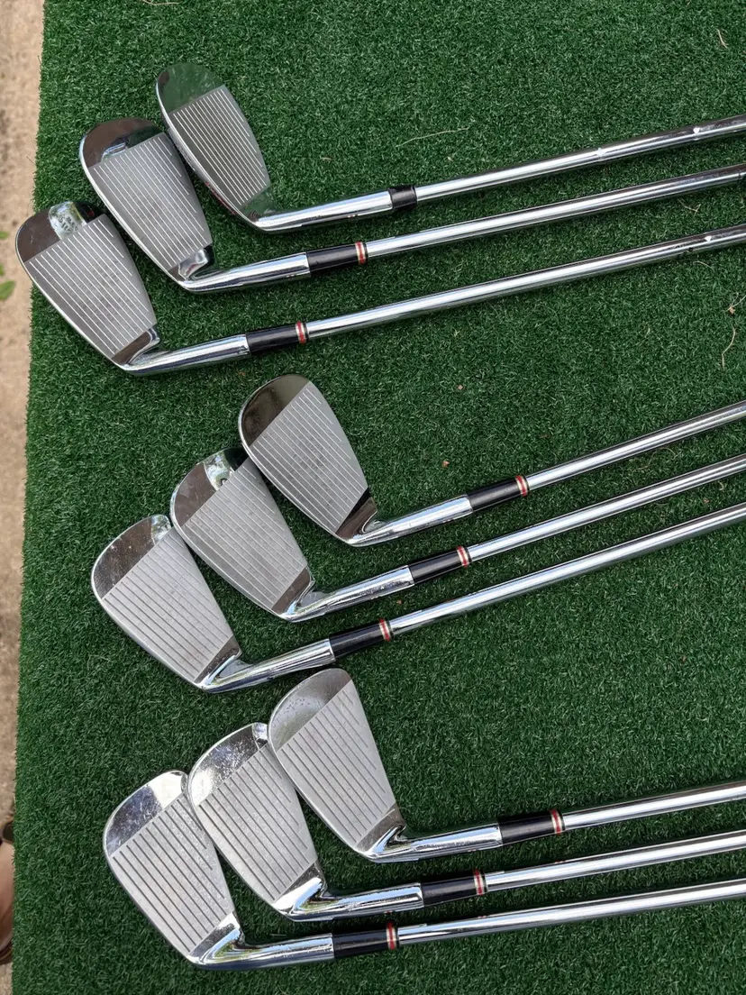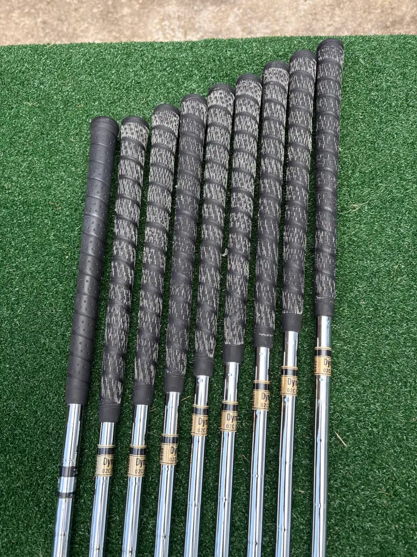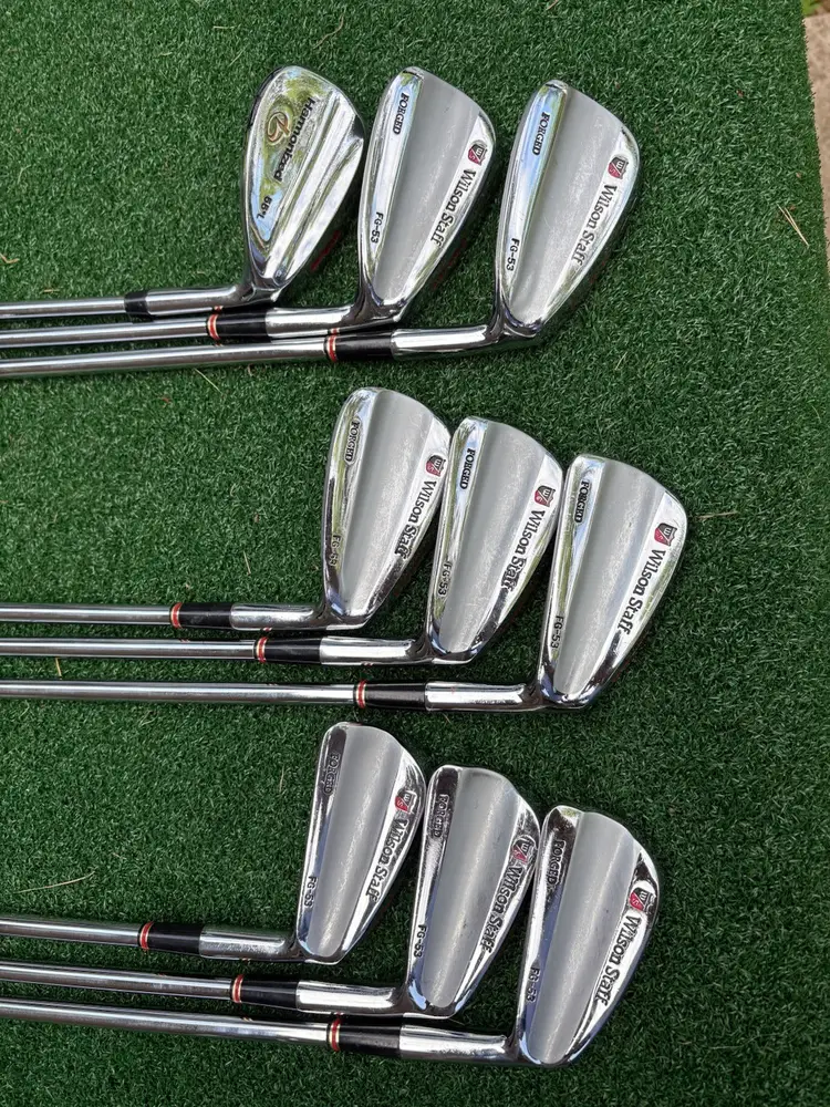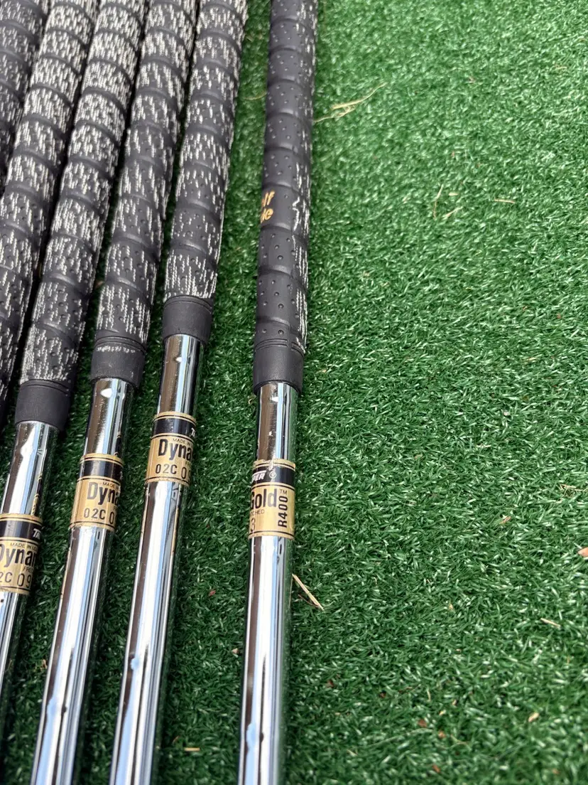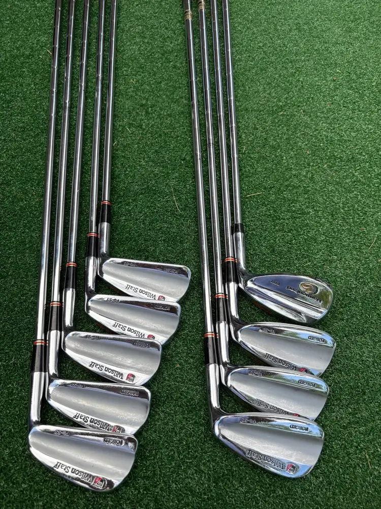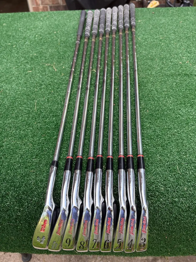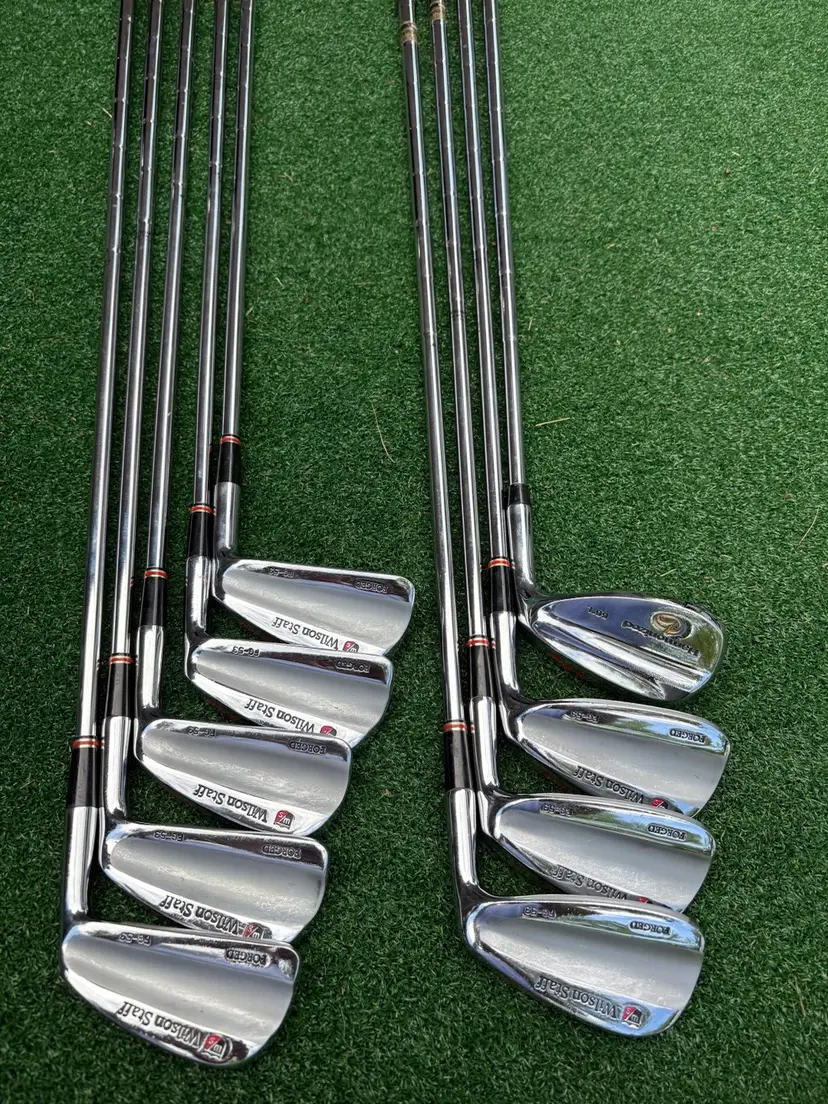Very nice example of a classic Wilson forged iron set. 3-pw gooseneck irons plus a Wilson harmonized sand wedge. Irons have been cleaned and polished and looking sharp. Matching golf pride tour wrap corded grips on all but sw. Frequency matched dynamic gold R400 shafts with excellent shaft bands.