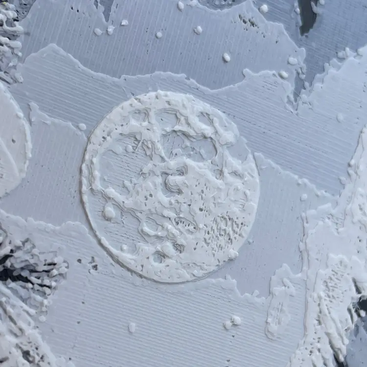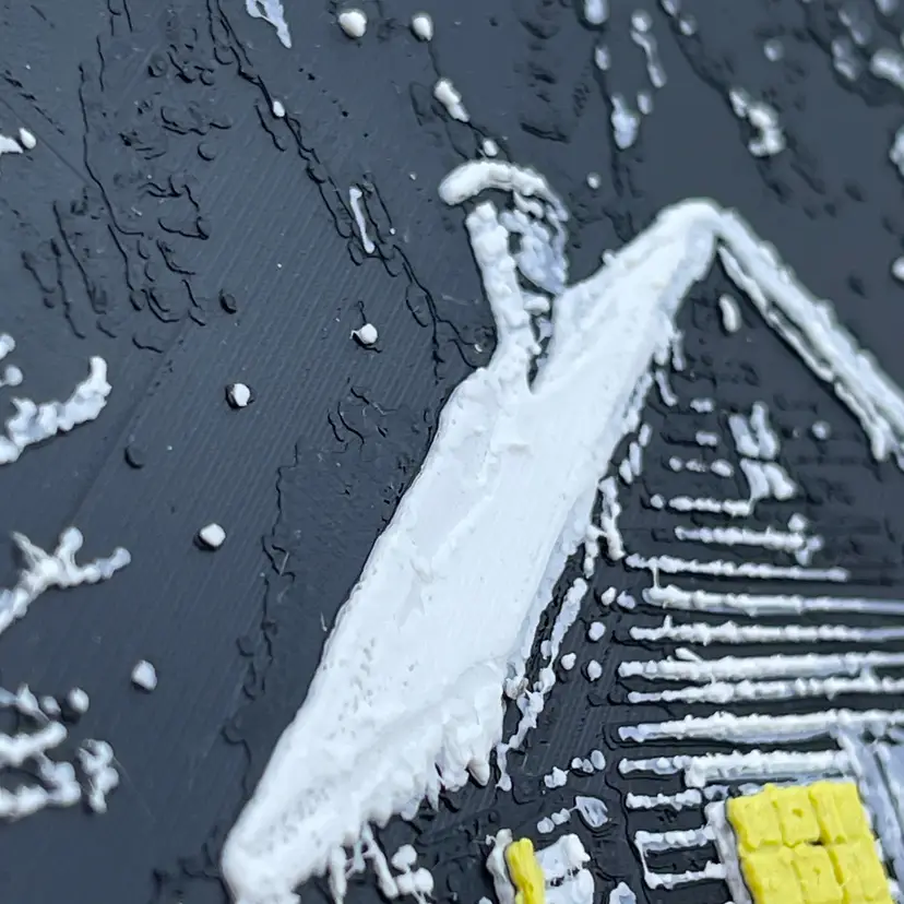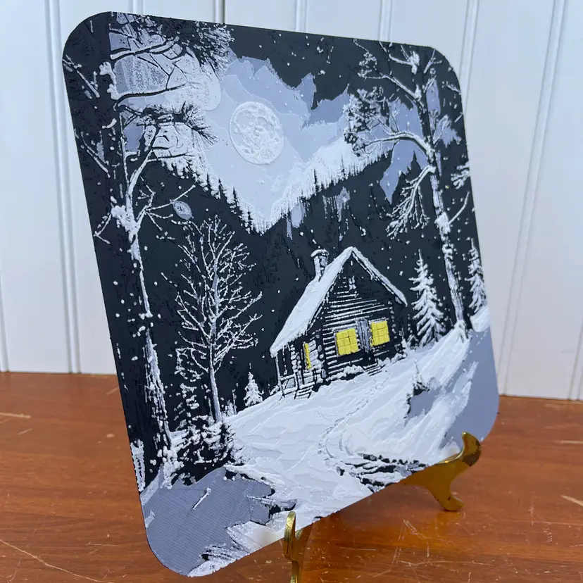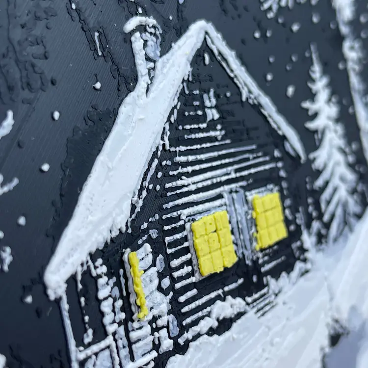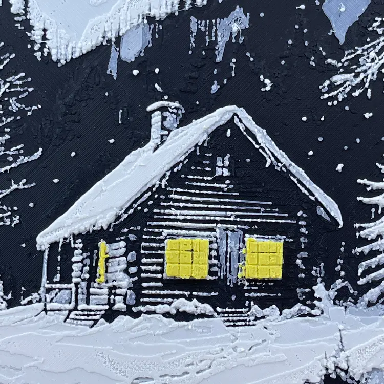 Beautiful 3D printed winter cabin in the snow. The yellow glow of the lights through the windows really pops off the white and black of the rest of the scene. The texture and detail is bound to be a conversation starter.