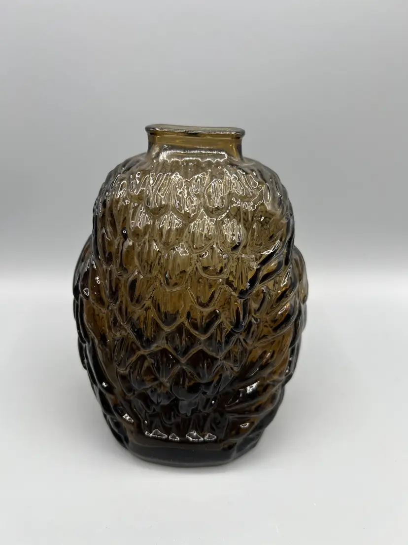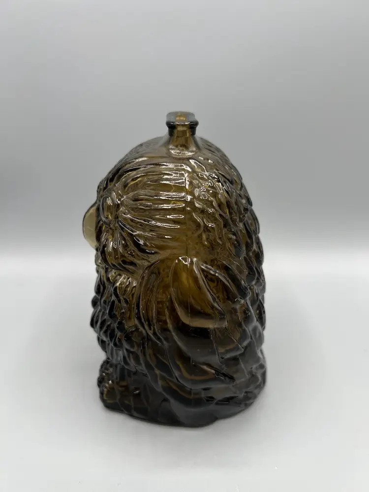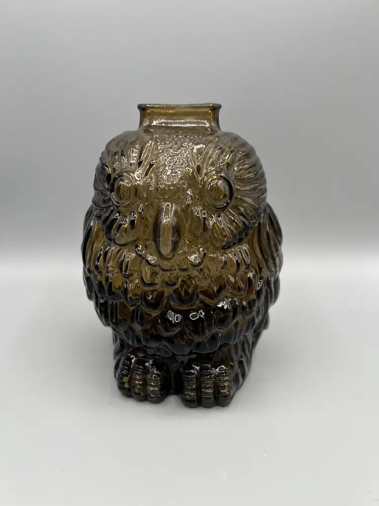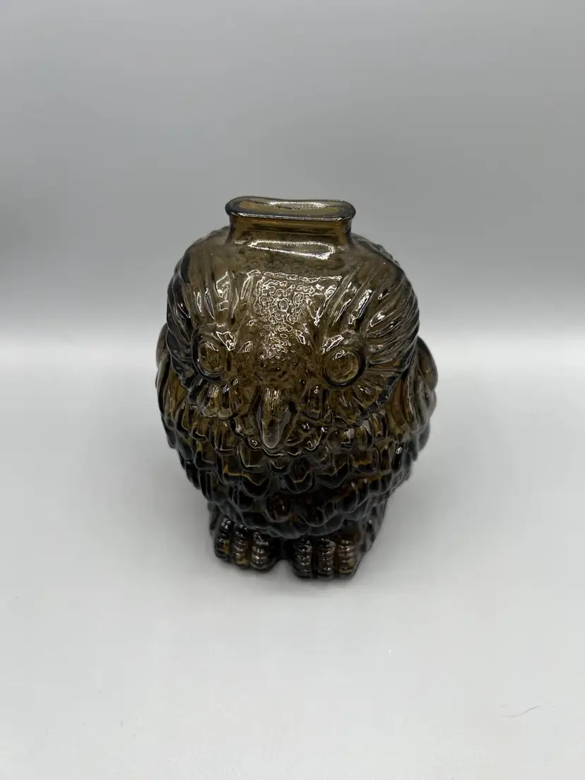 Vintage Embossed Wise Old Owl Smoky Glass Coin Money Bank , 6.5 inches tall.
