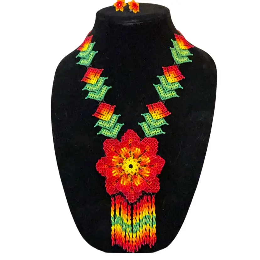 Beautiful green, red, orange and yellow seed bead artisan necklace. Traditional art form by the Huichol people of Mexico known for its vibrant colors, intricate designs and spiritual symbolism. Measures 24” around.