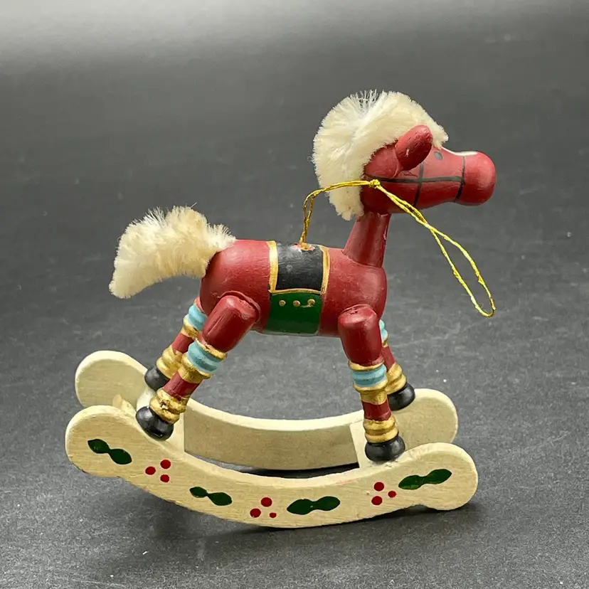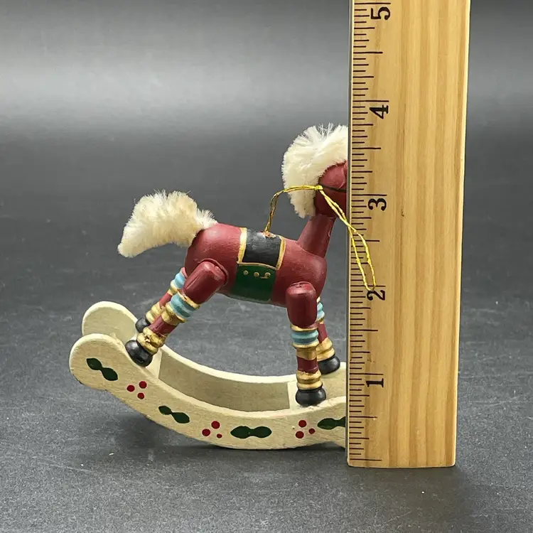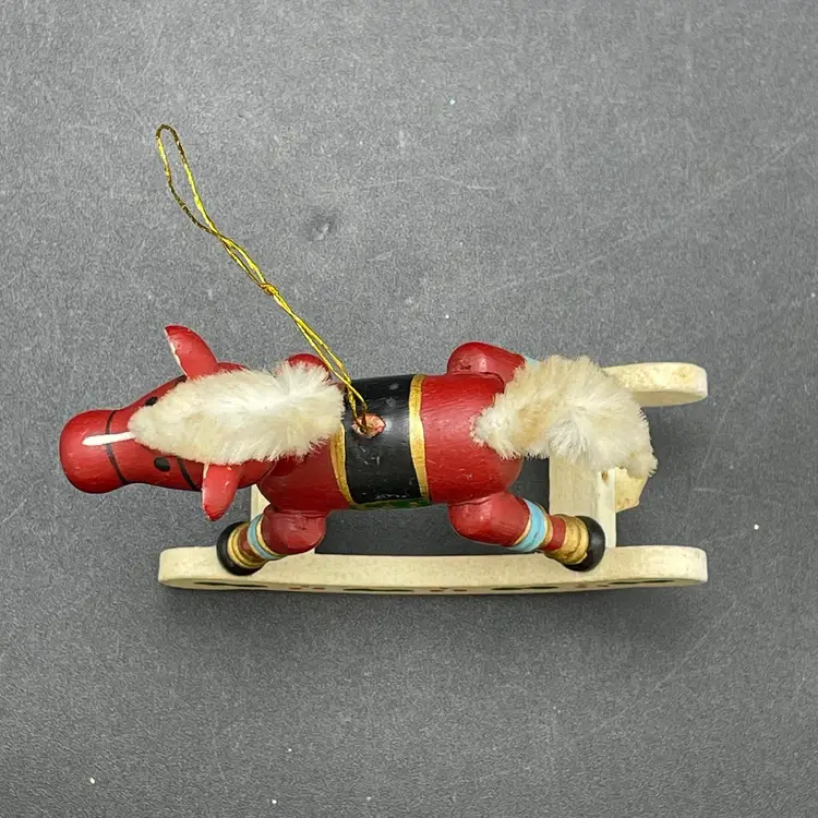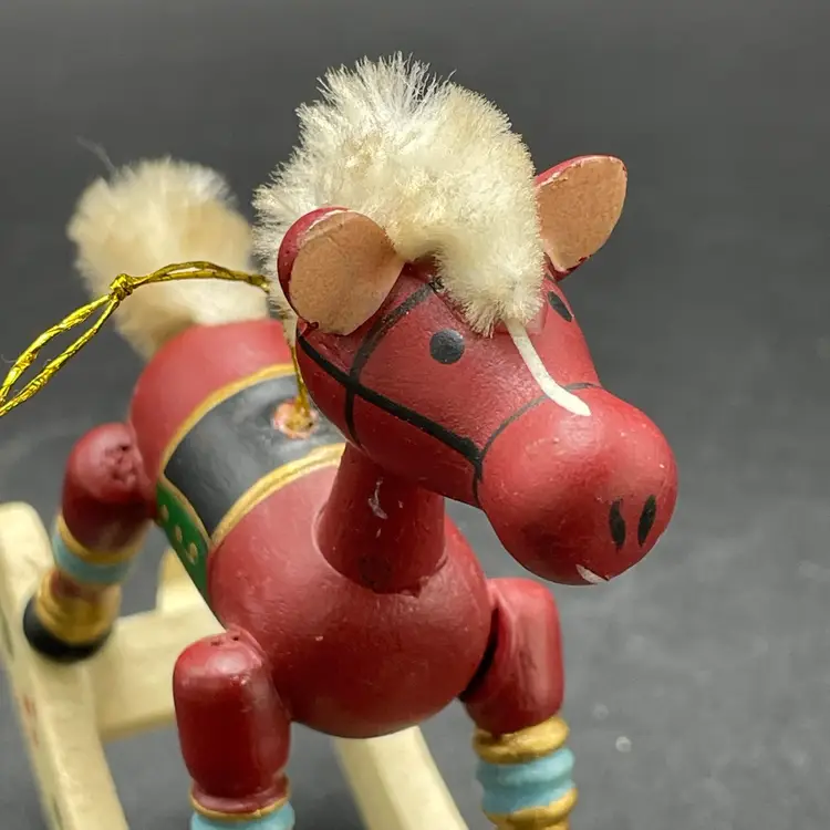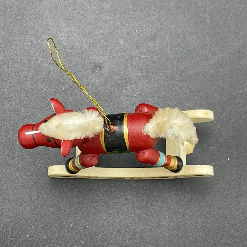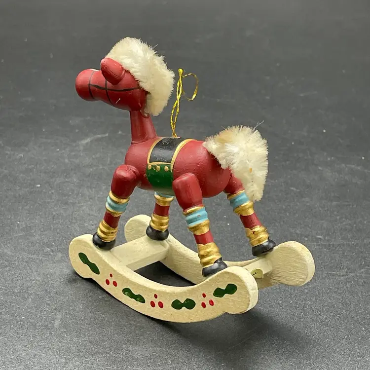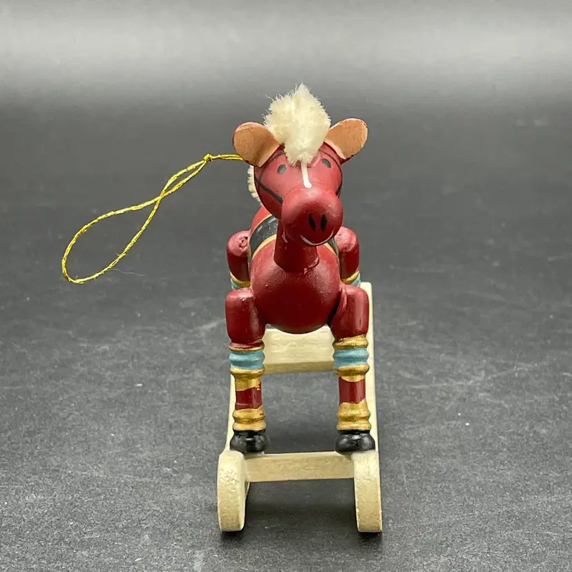 This is a vintage Russ wooden rocking horse hanging ornament. Measures approximately 3.75" tall x 4" long. No chips or cracks.