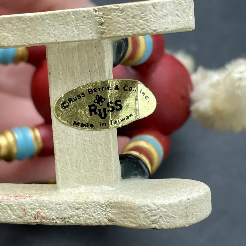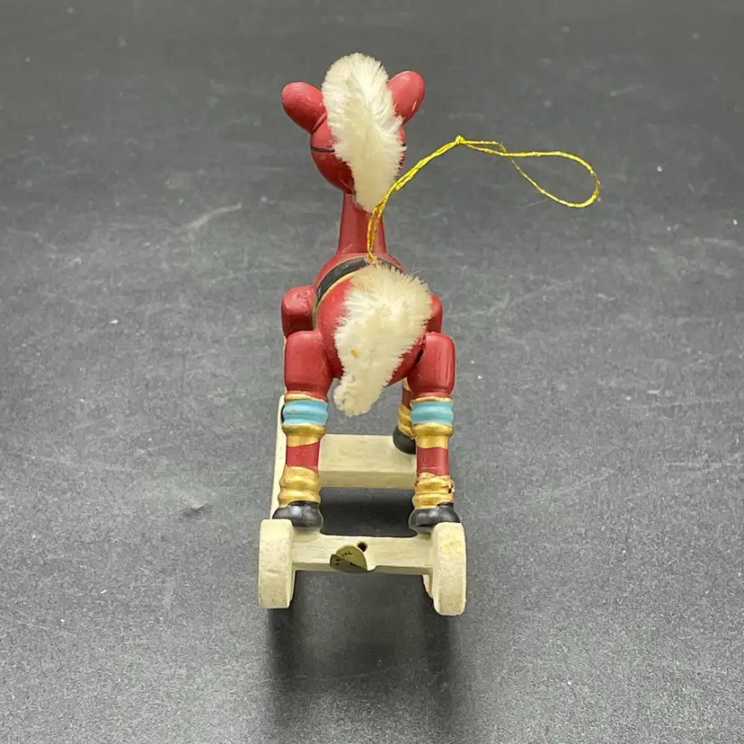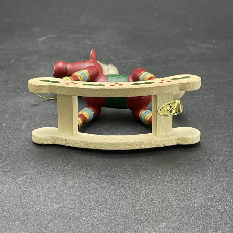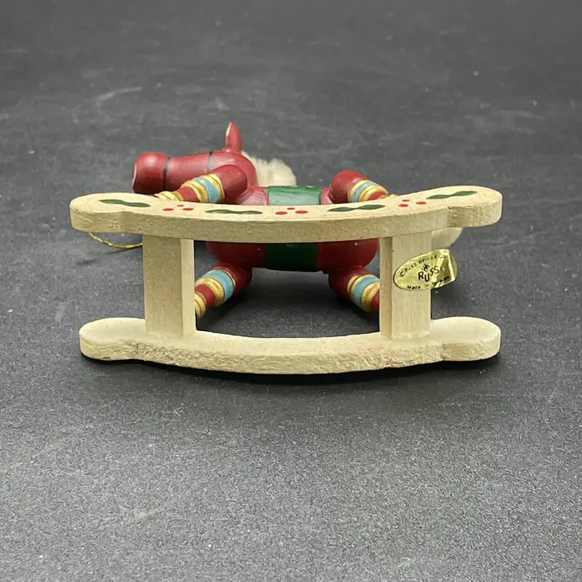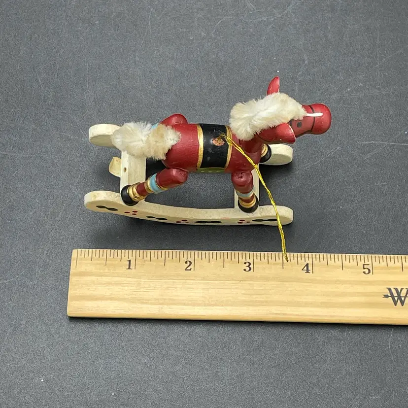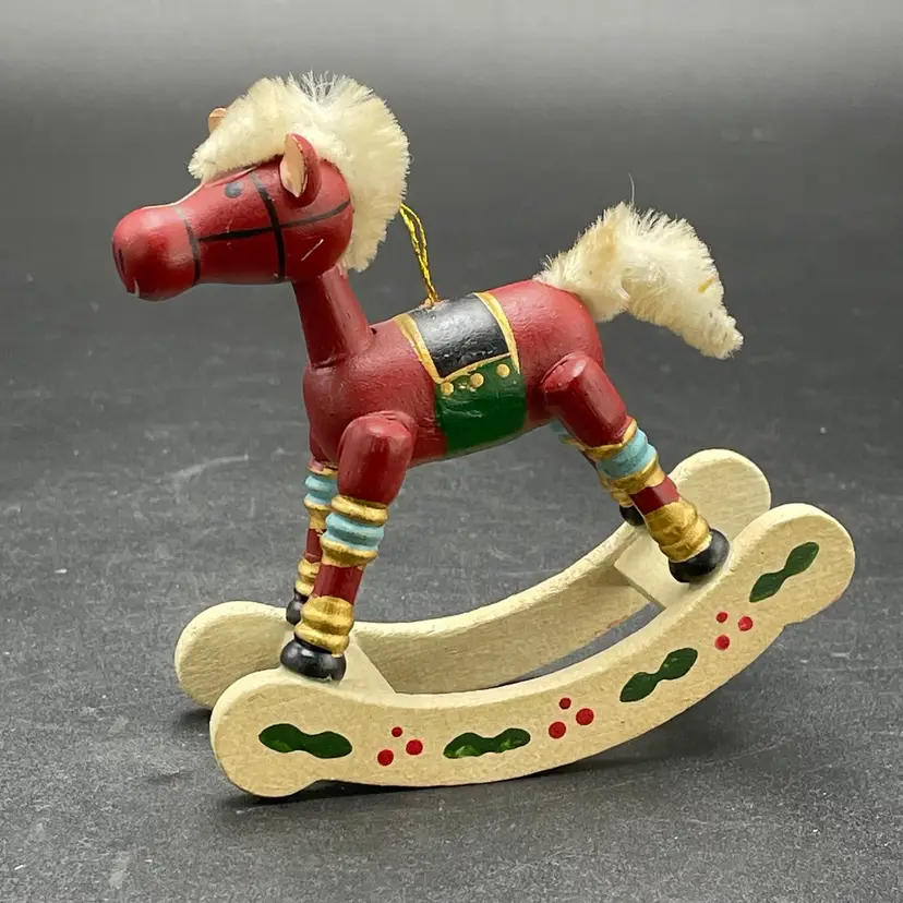 This is a vintage Russ wooden rocking horse hanging ornament. Measures approximately 3.75" tall x 4" long. No chips or cracks.