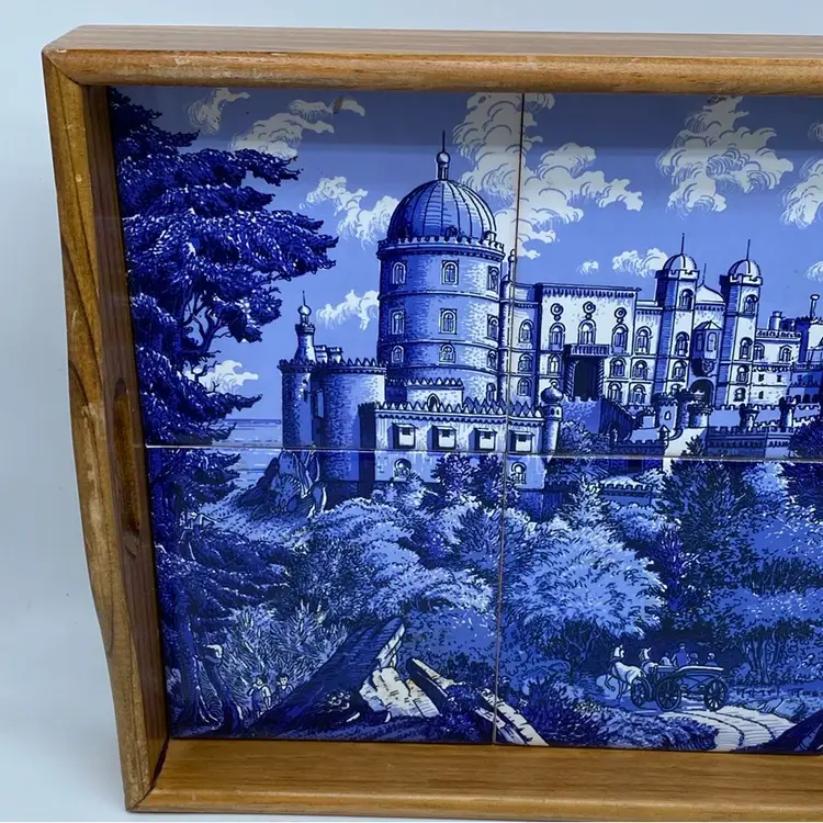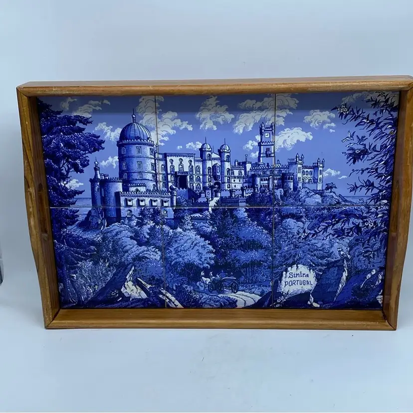 Sintra, Portugal, is a renowned tourist destination famous for its romanticist architecture, including the Pena Palace, which is likely depicted on the tiles. Such trays are often produced as souvenirs, capturing the essence of a place for visitors to take home. The combination of wood and ceramic makes for a durable and visually appealing decorative item.