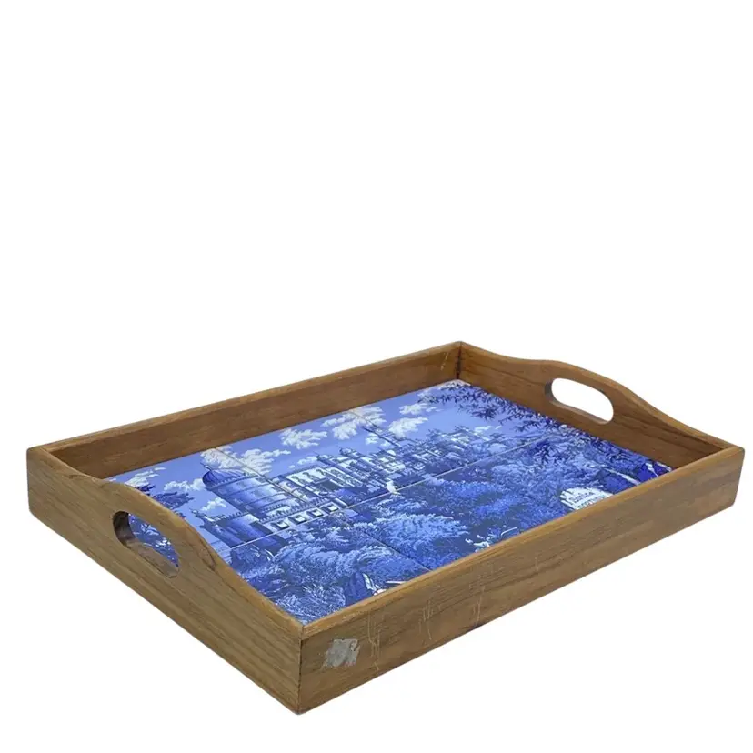 Serving trays with decorative tile inserts have been popular for centuries, often featuring scenic views or historical motifs. These trays serve both a functional purpose for serving refreshments and an aesthetic one as decorative pieces. The use of blue and white ceramic tiles, reminiscent of Portuguese azulejos or Dutch Delftware, adds a touch of traditional artistry to the item.