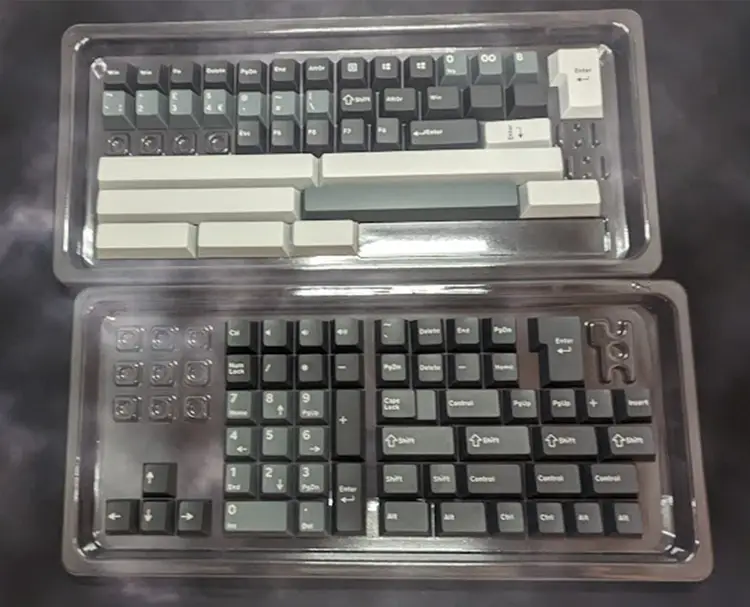 This is the Wormier K87 Stacked Acrylic Grey keyboard. This is a limited edition keyboard that's not available in this colorway any longer. included are a full TKL keyboard of Akko CS Silver Crystal switches that have been hand-lubed for optimal feel and sound. Finally the keycaps are the kpRepublic Ghost Judge Double-shot PBT keycaps in the Apollo colorway. The Akkp CS Silver Crystal switches are full PC switches and their grey color matches the keyboard perfectly complimented with the thick PBT keycaps make for a striking combination that is easily configurable to match any decor or mood.