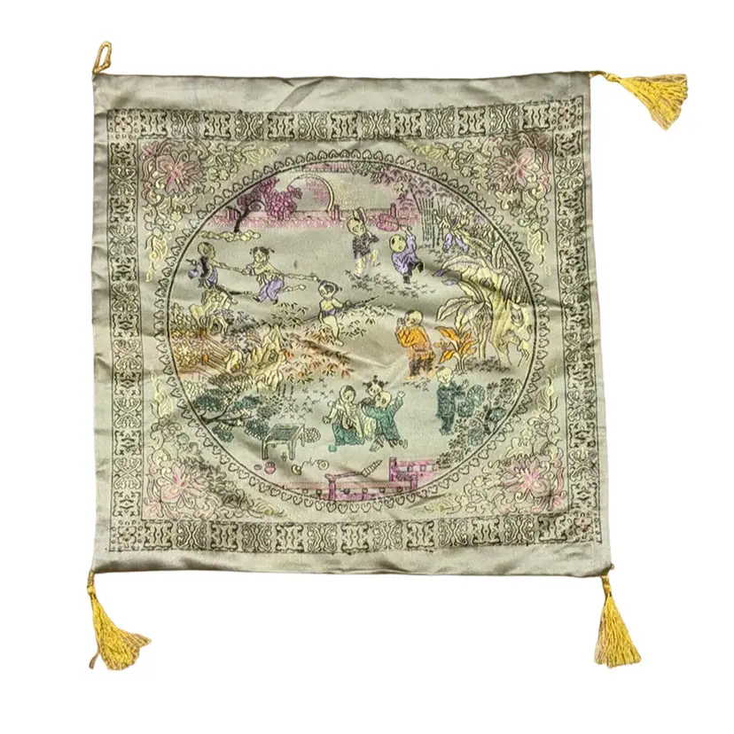 Item is as is pre-love missing one tassel has small stain in middle of circle. See picture both sides are the same. Has a zipper to put pillow or stuffing.