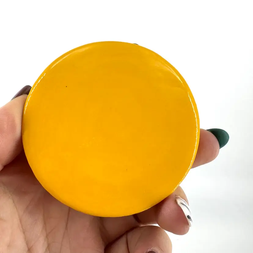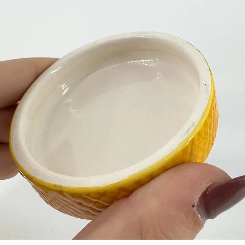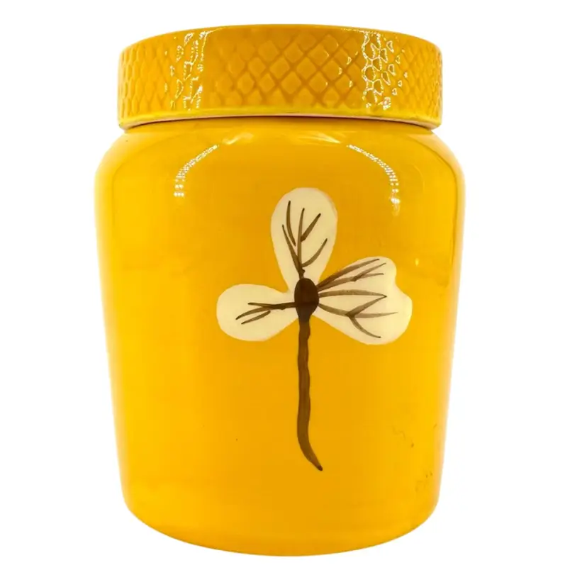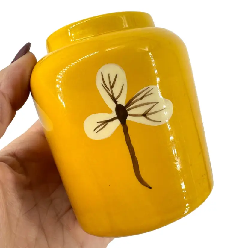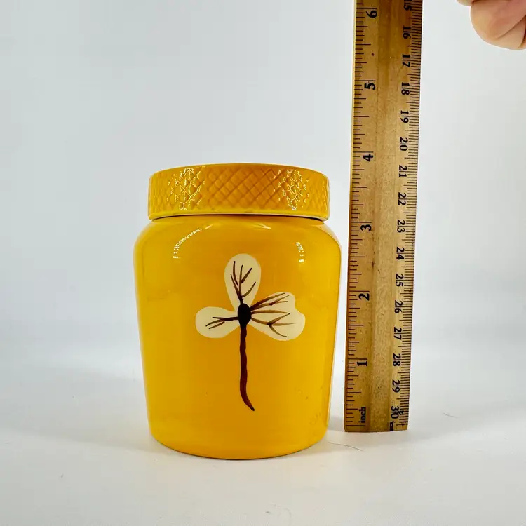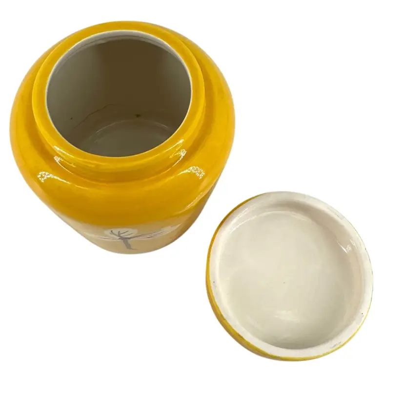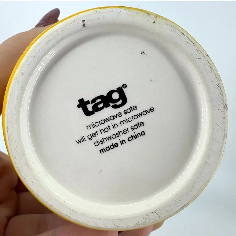 This yellow ceramic jar is approximately 4” in height. There are NO chips or cracks anywhere. It is marked “TAG” on the bottom of the jar.