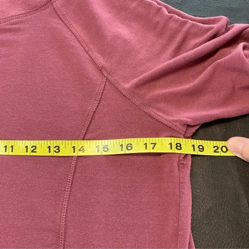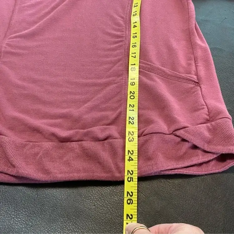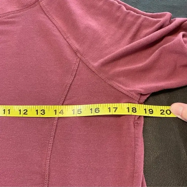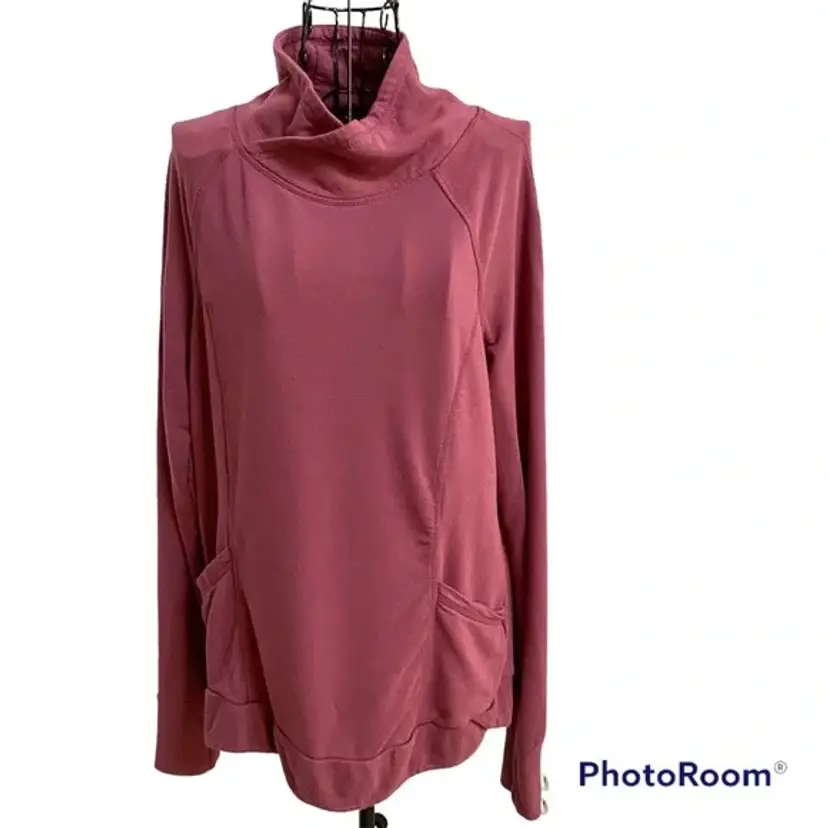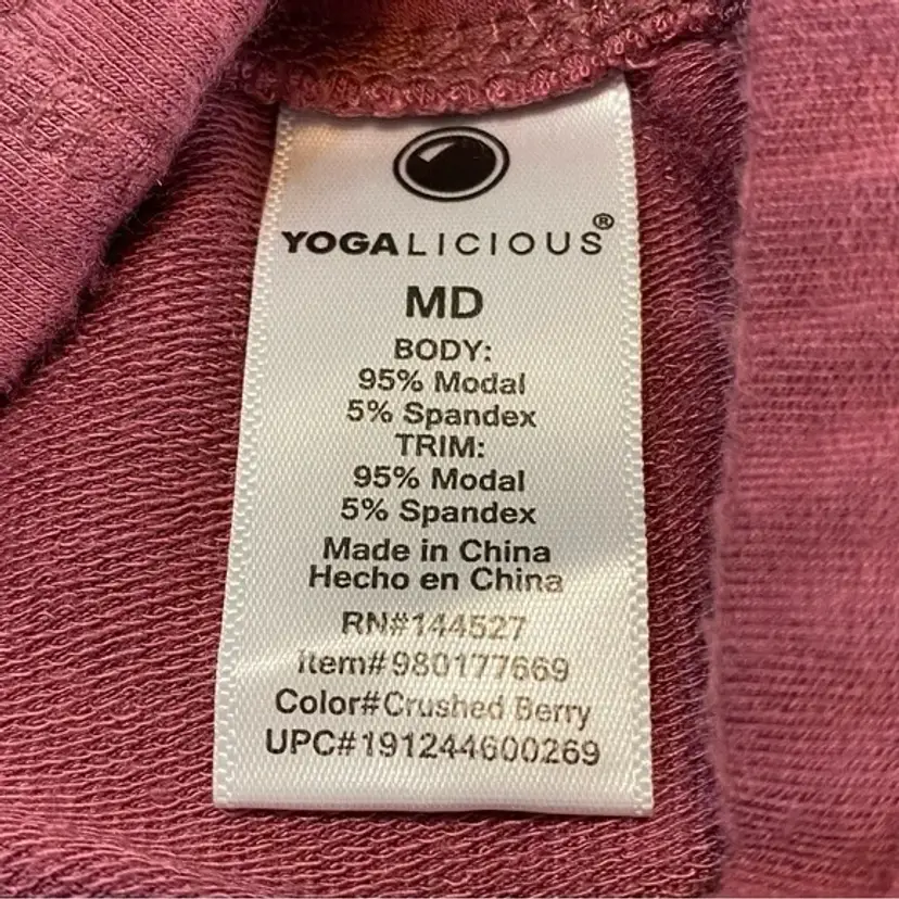 Very soft burgundy colored (Crushed Berry) Yogalicious pullover top. Sleeves have thumbholes. Two front pockets. Size M. Measurements shown in pics. 566WN6N2GT1
