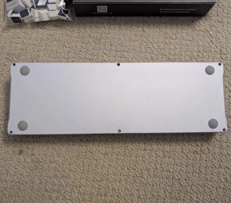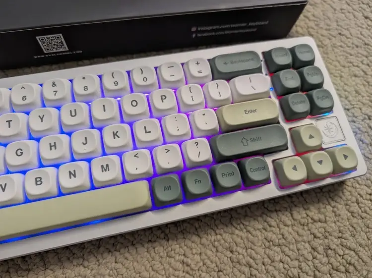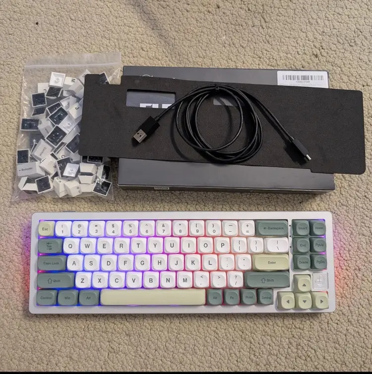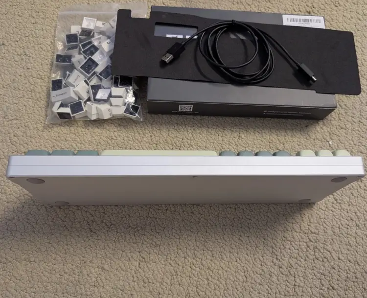 Does not come with a box. Comes with a charging cable, complete keycaps set, the removed foam layer, and original keycaps.