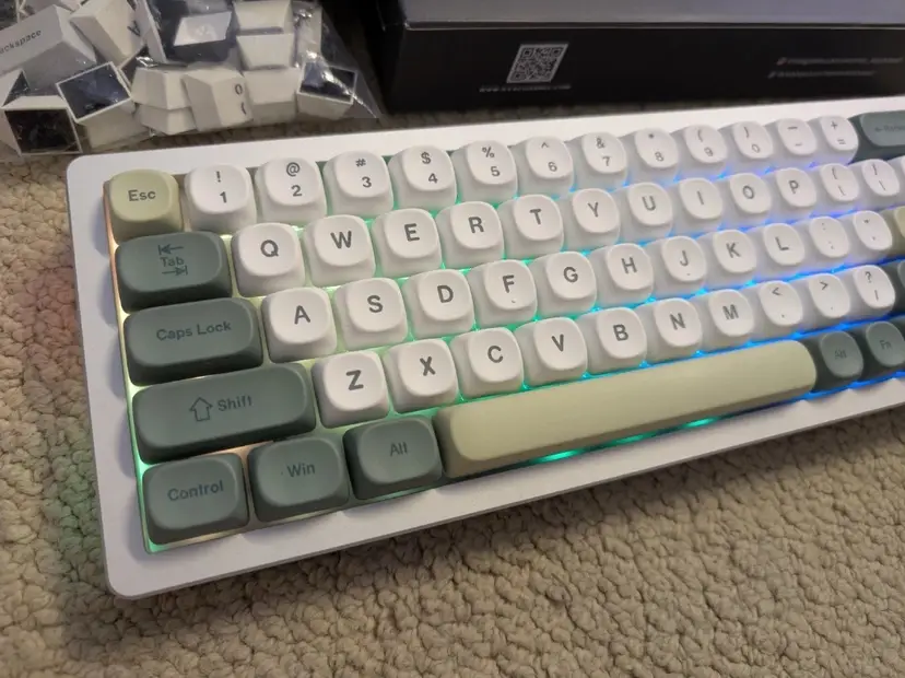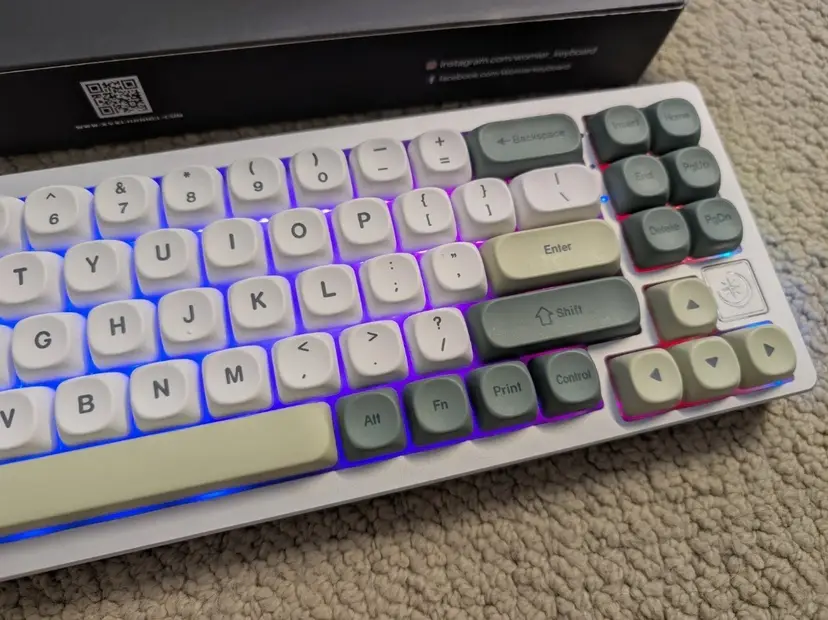 Has tape mod, force break mod, and re-lubed stabilizers. Installed with Jerrzi Clear Tactile switches, and dye-sub PBT key caps in MOA profile.