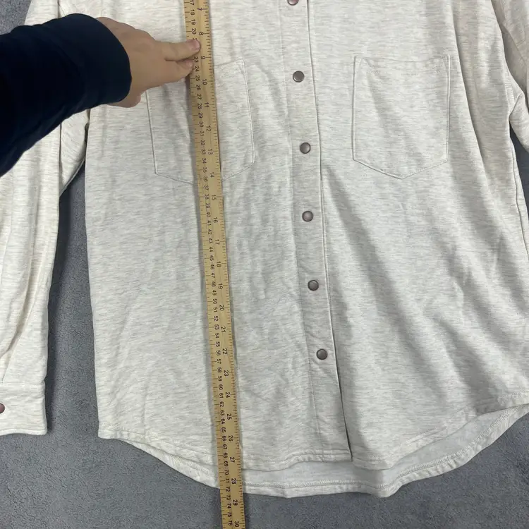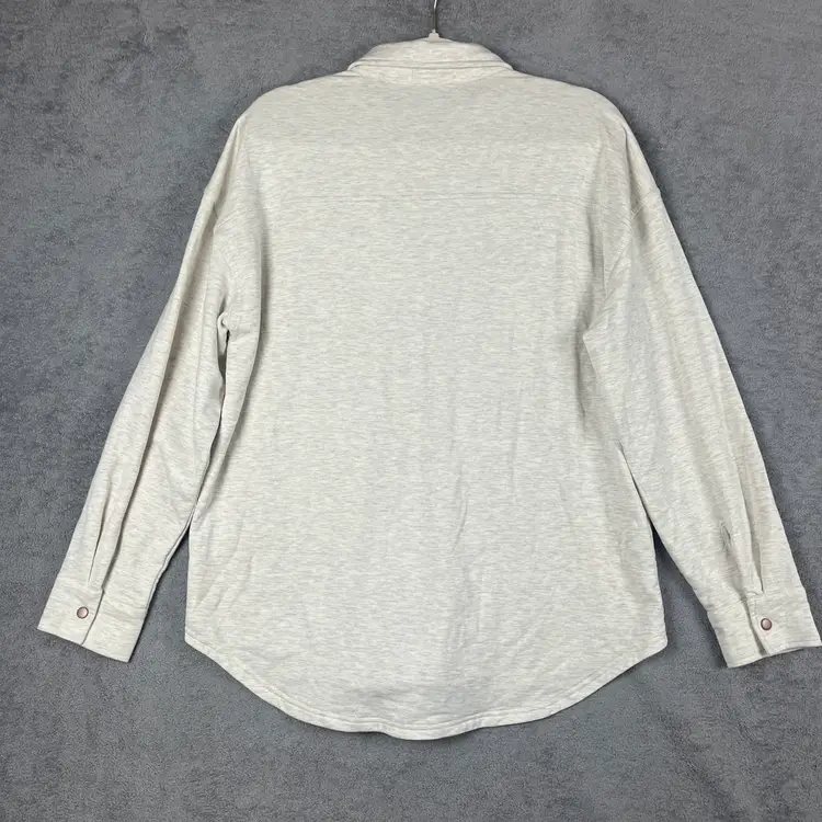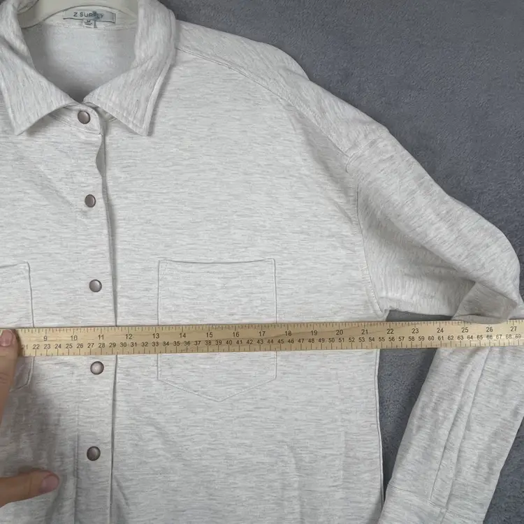Details Brand: Z SUPPLY Style: All Day Jacket Size: Oversized Medium — See pictures for measurements. Color: Cream / Oatmeal Heather Fabric Content: 97% Modal, 3% Spandex Fabric Feel: Ultra-soft brushed knit with a cozy, fleece-like interior Style Features: Snap-button front, collared neckline, curved hem, and dual chest pockets Made in China